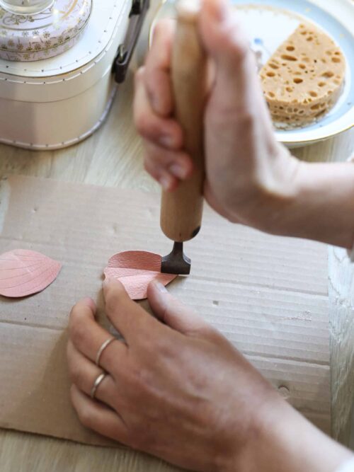 Le découpage est mon mode d’expression privilégié. C’est sous les lames des ciseaux que se dessinent les formes stylisées, souvent fleuries, qui serviront au gabarit de chaque création. J’y ajoute ensuite un marquage ou une touche de dorure à chaud pour plus de préciosité. Ce répertoire de motifs symboliques constitue un langage sensible inspiré, entre autre, de l’art nouveau.