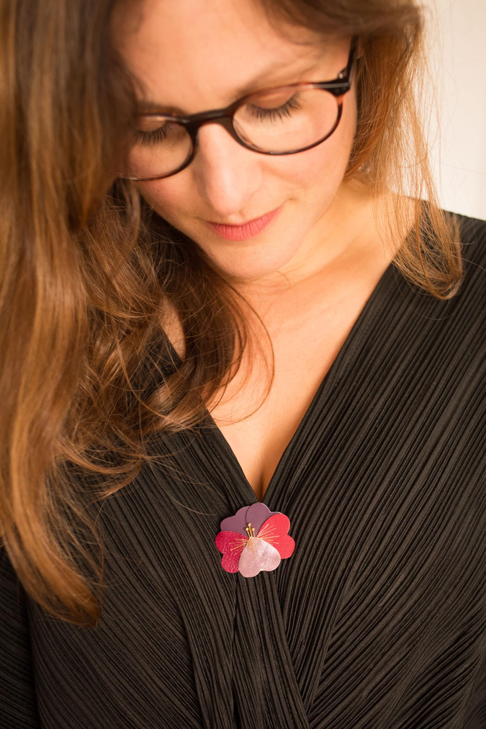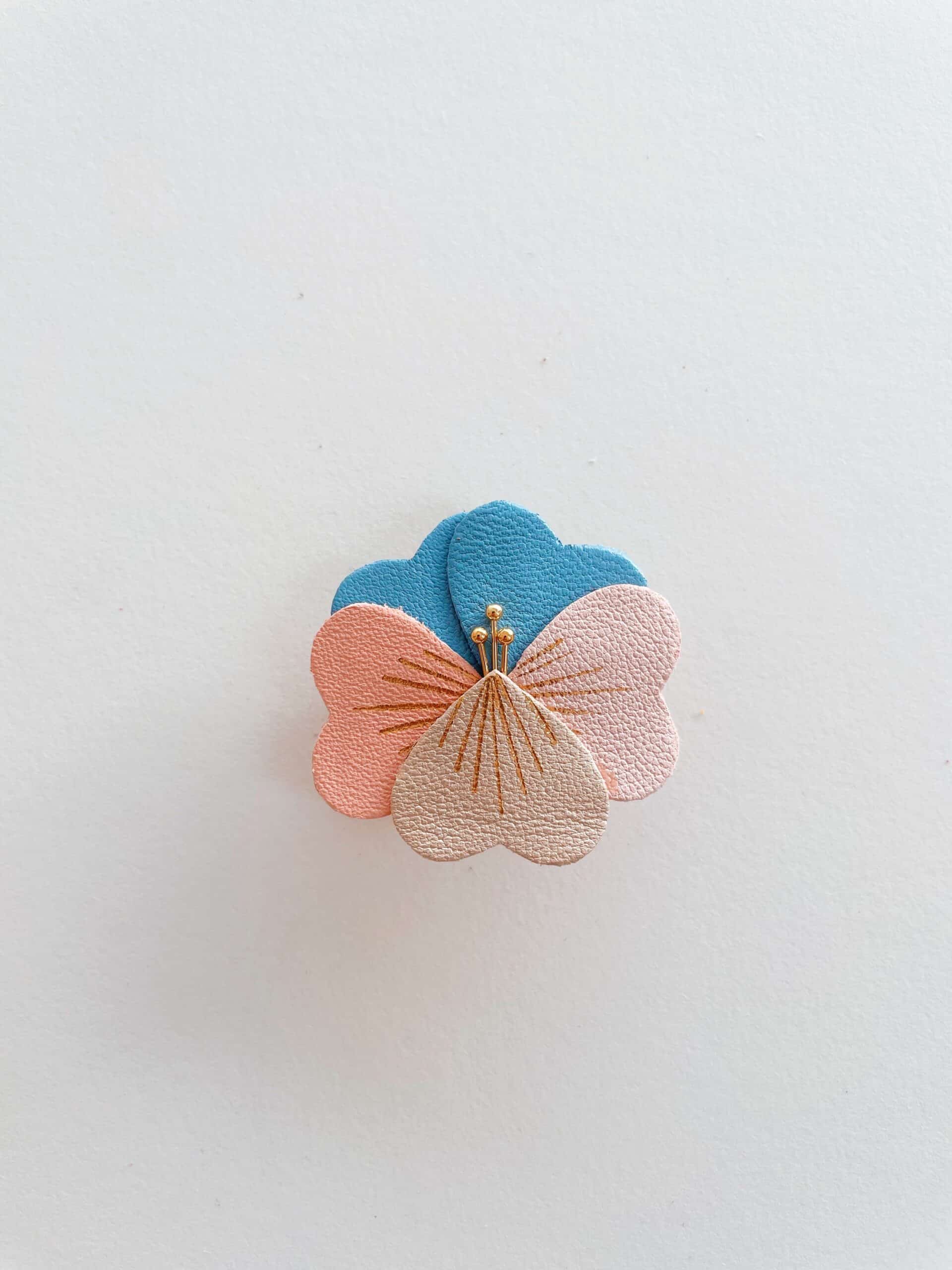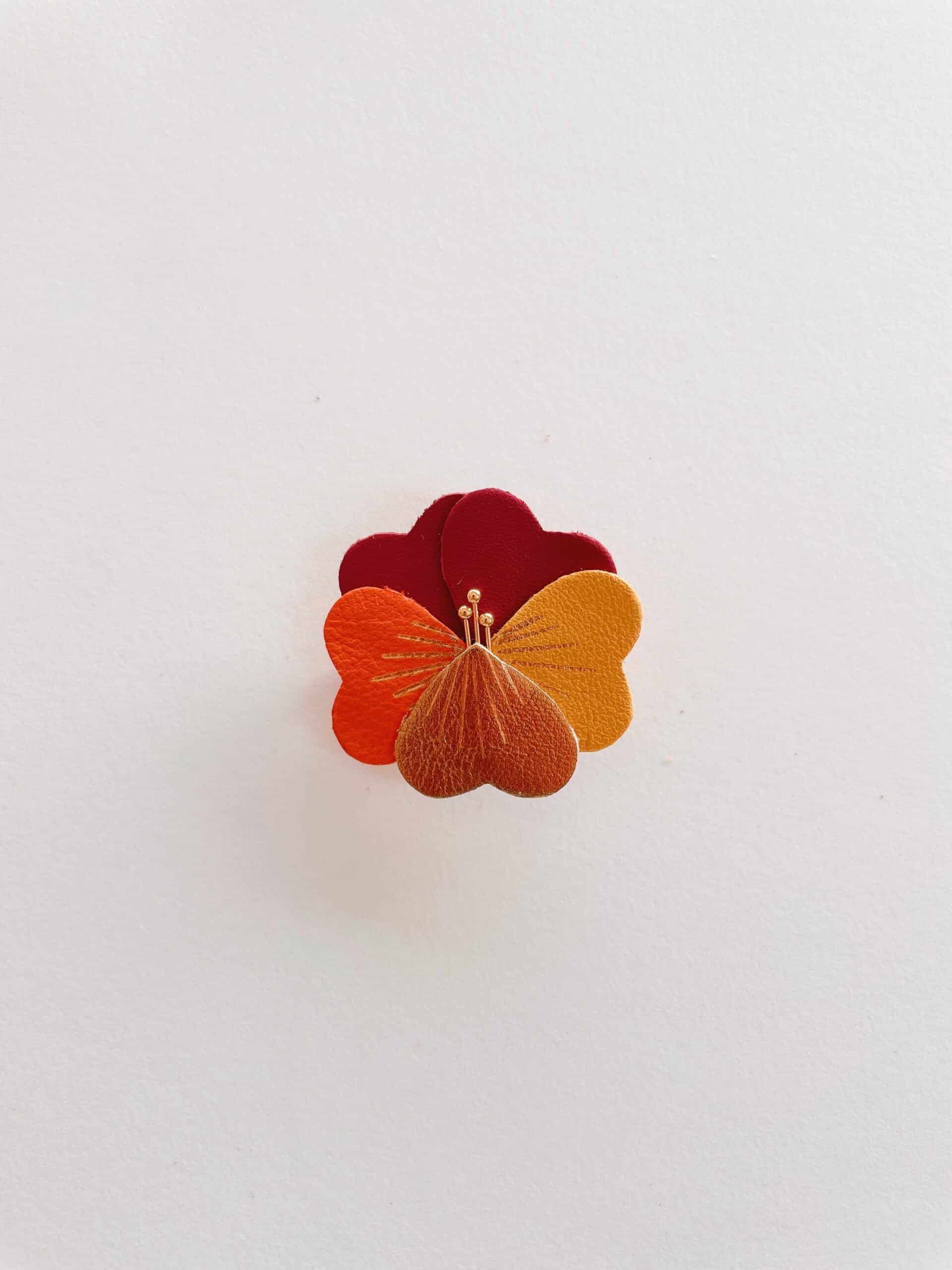 Une broche florale comme un éclat de lumière d’hiver. Pétales colorés en cuir surcyclé, détails en dorure à chaud à l’or fin, étamines et support en laiton doré or fin. Dimensions : environ 4 cm.