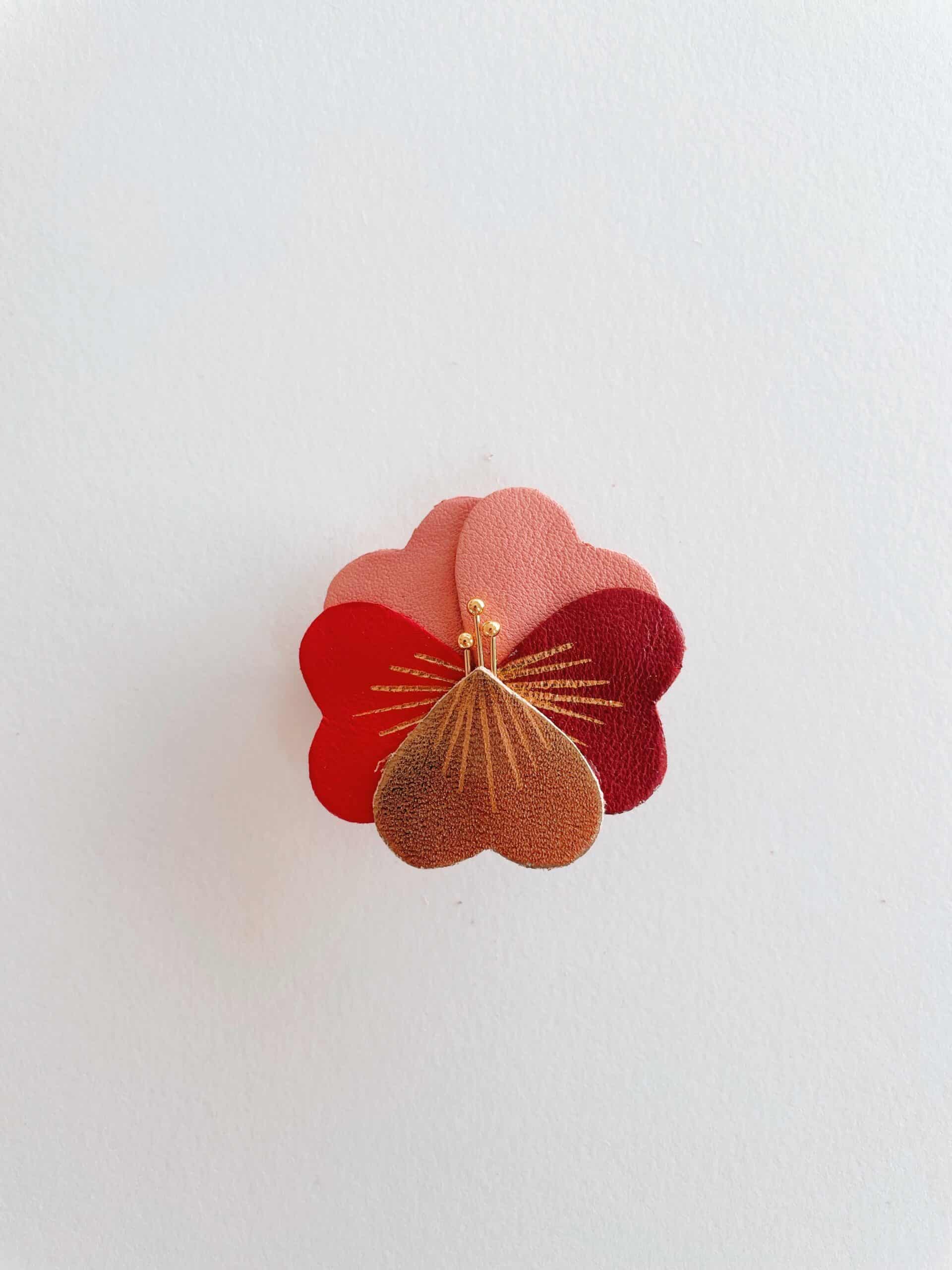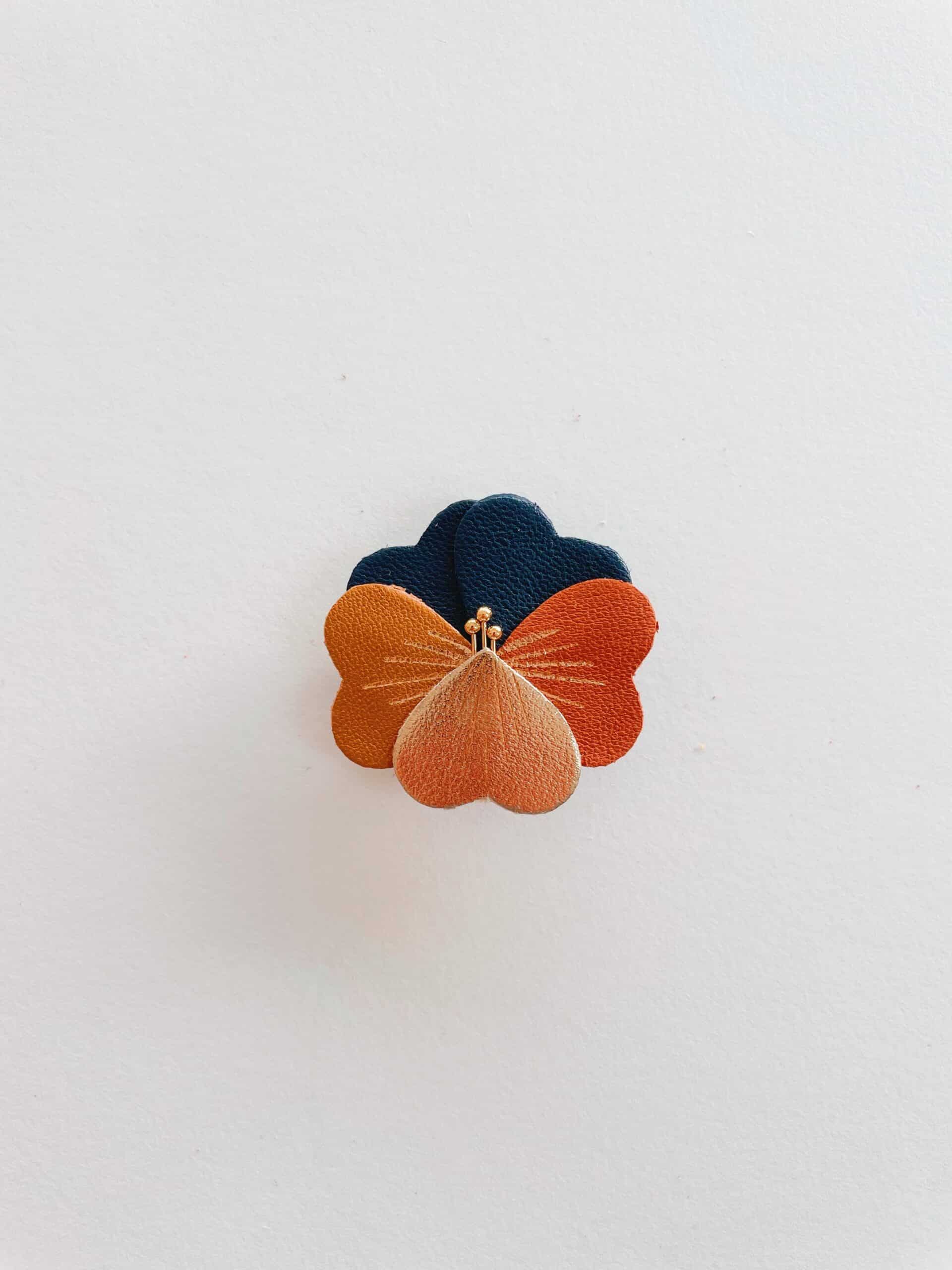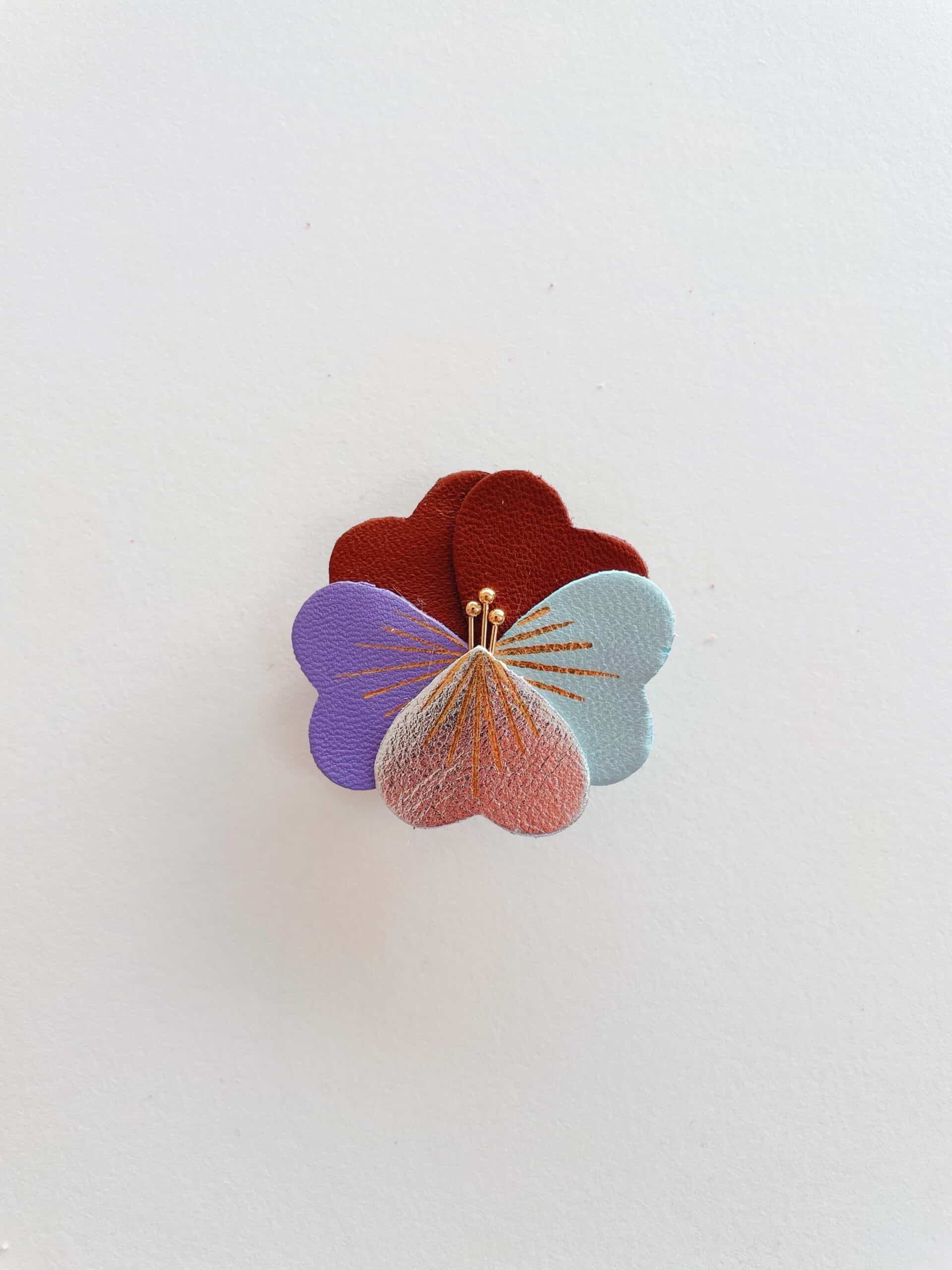 Ces pensées lumineuses se déclinent en une palette automnale et raffinée — brun mordoré, bordeaux profond, jaune doré, rose poudré, vert mousse, orange cuivré, violet grisé… Chaque broche est minutieusement découpée dans des chutes de cuir fin, puis décorée de délicates touches dorées à chaud. Un bijou artisanal poétique, pensé pour réchauffer l’automne-hiver d’un souffle floral.
