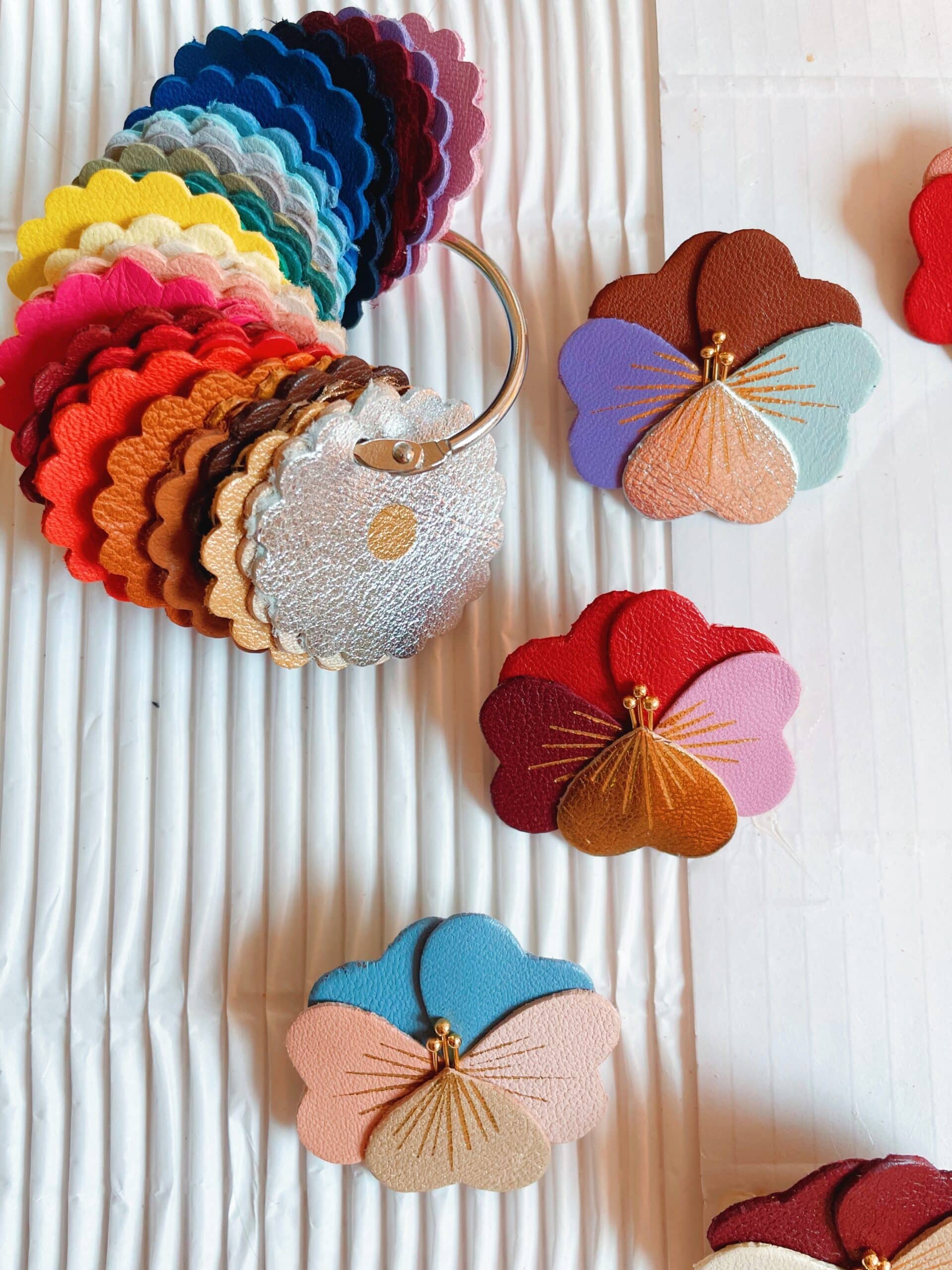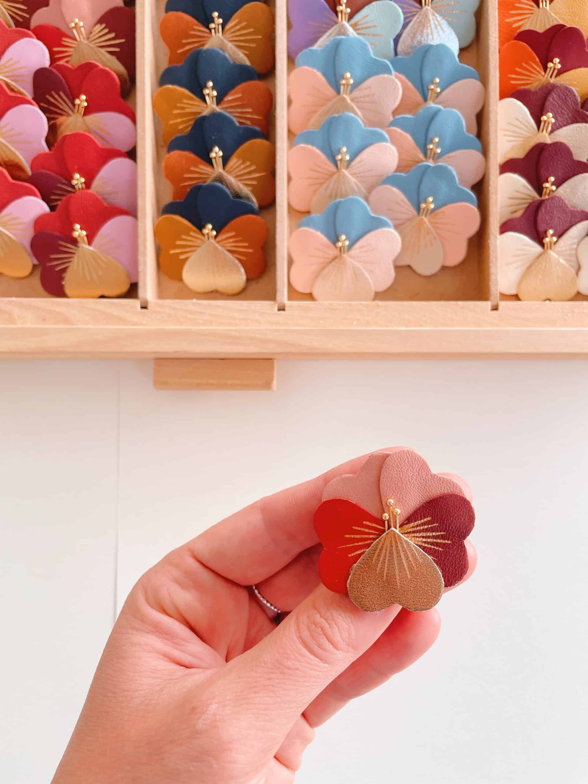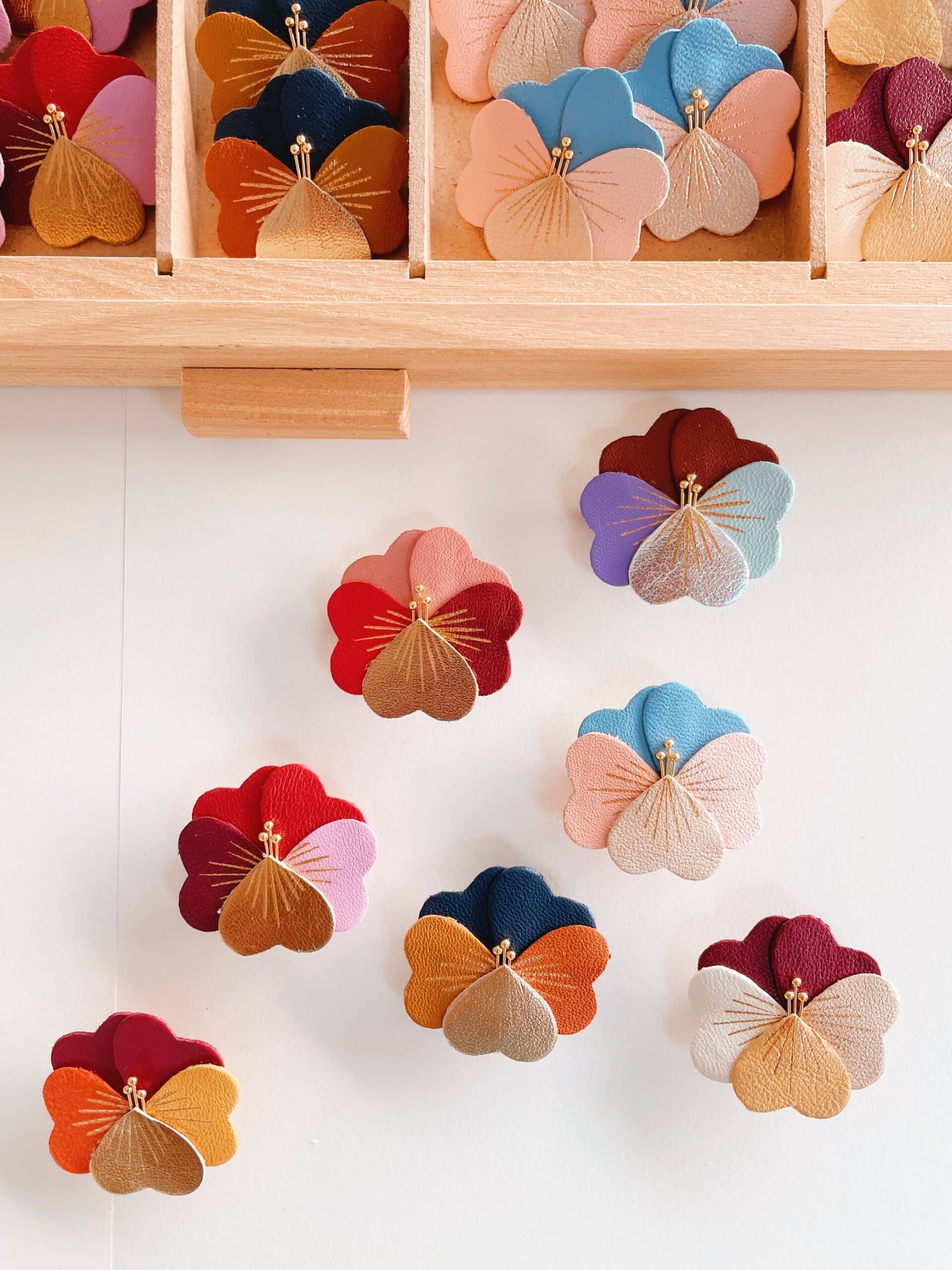 Ces pensées lumineuses se déclinent en une palette automnale et raffinée — brun mordoré, bordeaux profond, jaune doré, rose poudré, vert mousse, orange cuivré, violet grisé… Chaque broche est minutieusement découpée dans des chutes de cuir fin, puis décorée de délicates touches dorées à chaud. Un bijou artisanal poétique, pensé pour réchauffer l’automne-hiver d’un souffle floral.