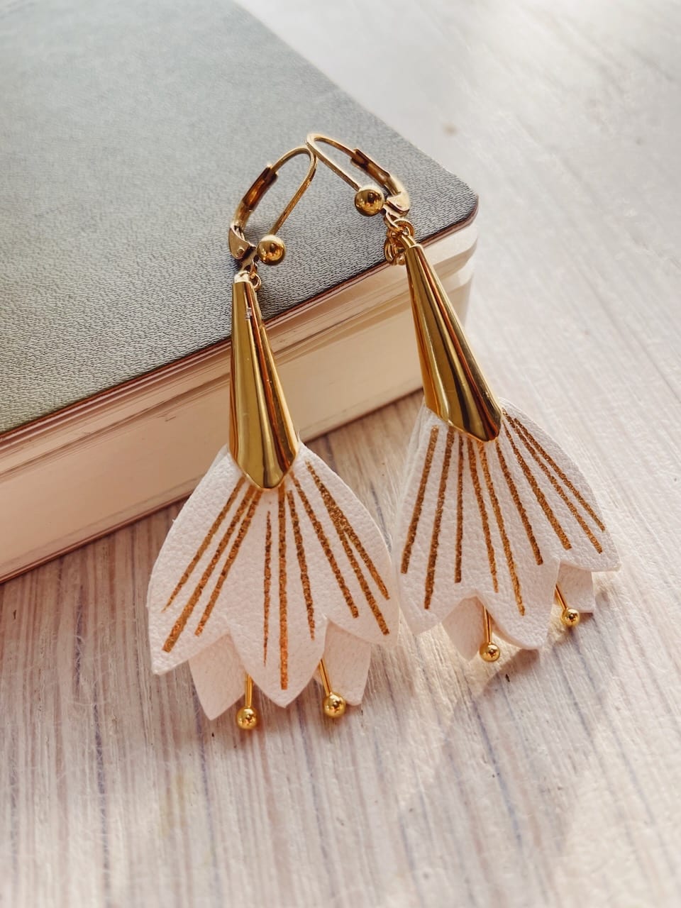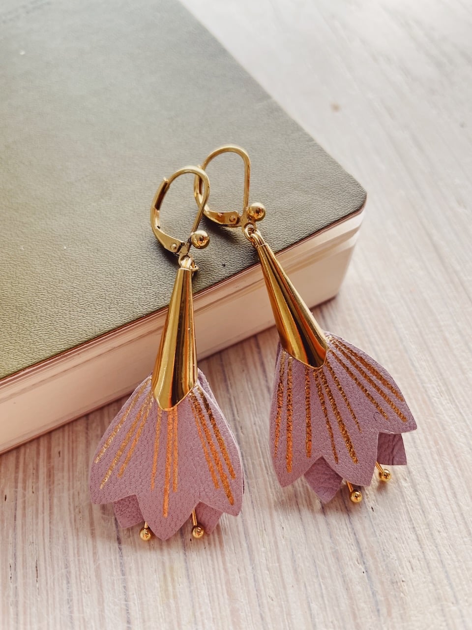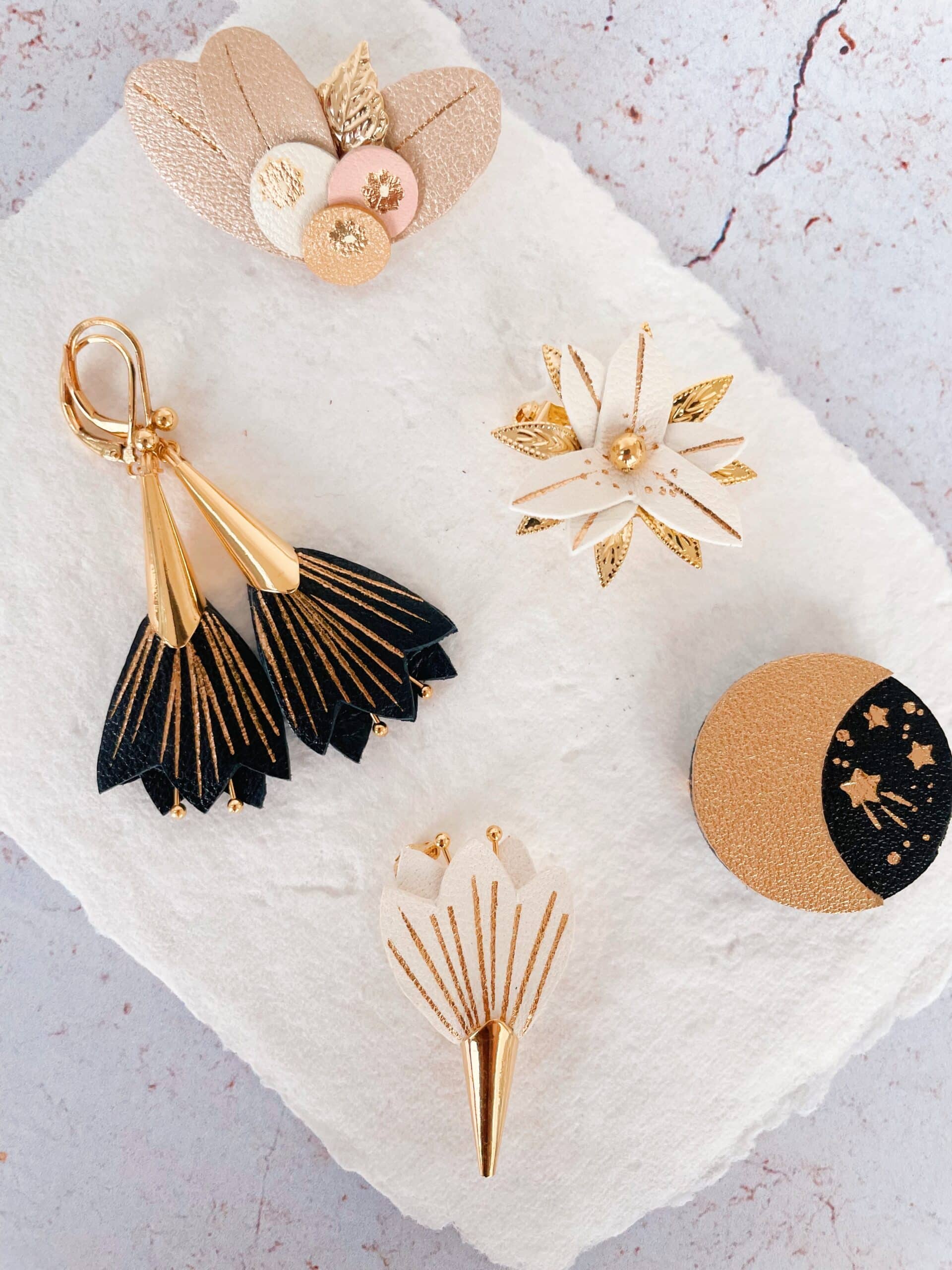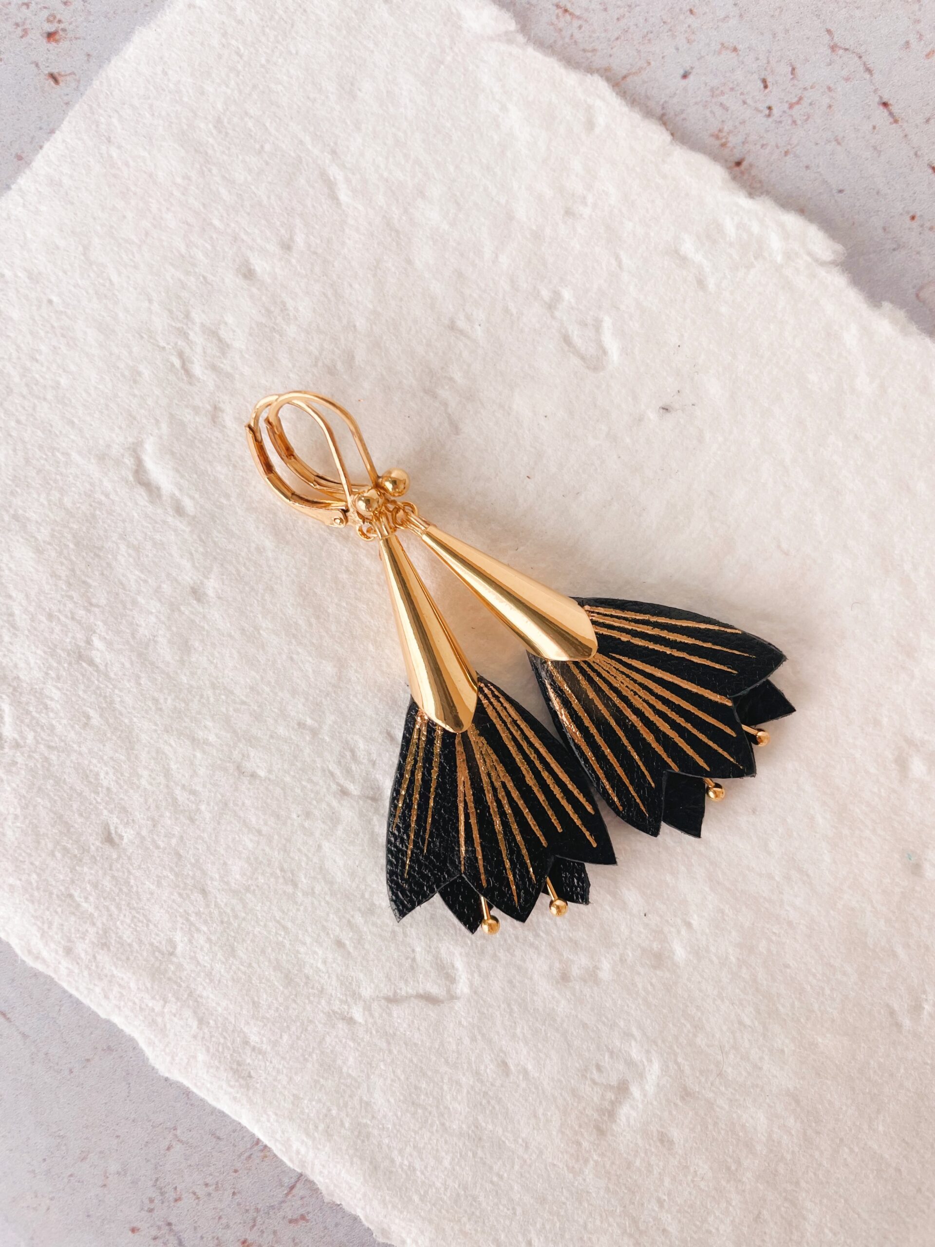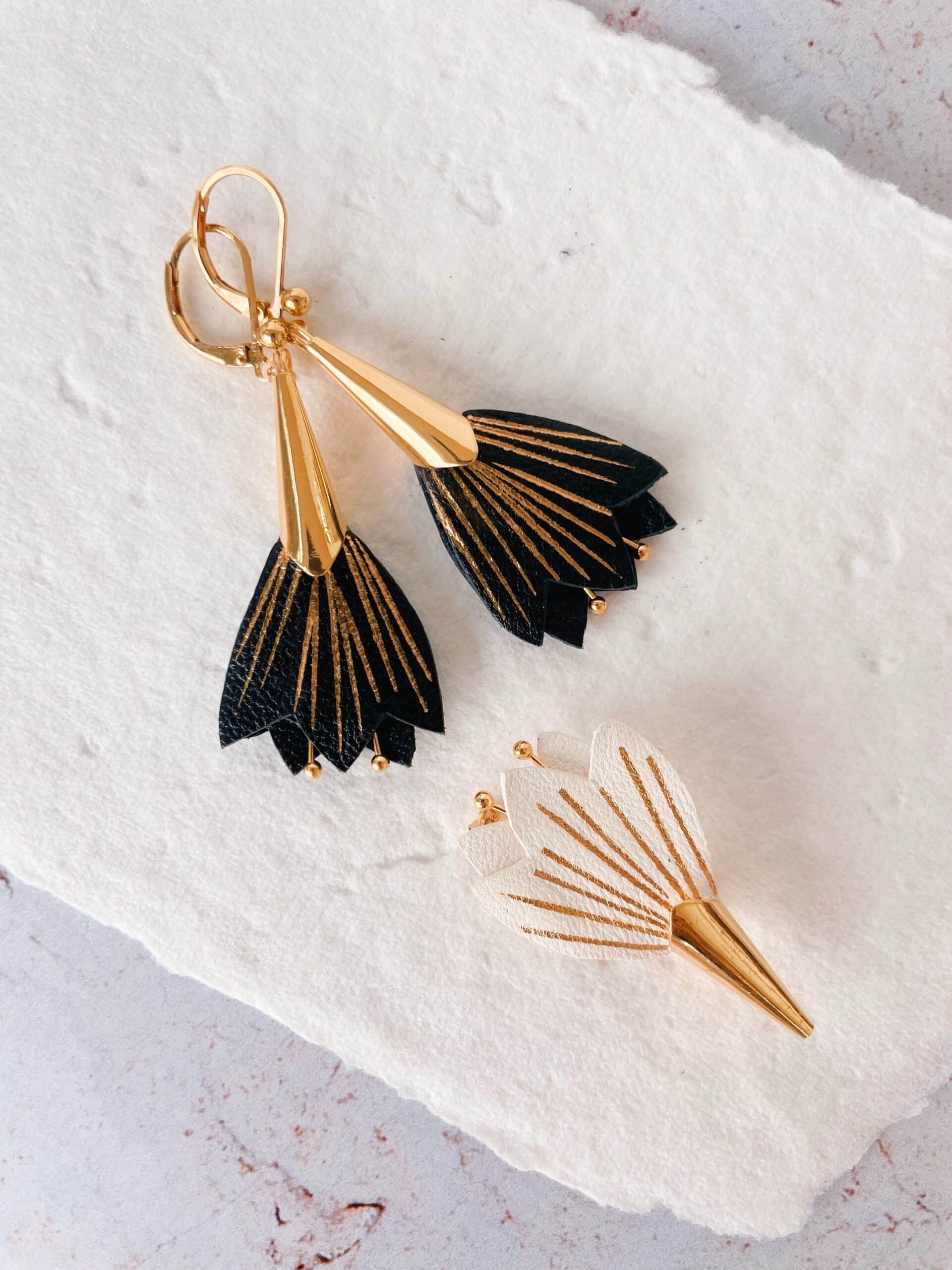 Une fleur durable à porter comme un grain de beauté pour une touche de poésie florale. Cuir surcyclé, dorure à chaud à l’or véritable, étamines, fourreau et dormeuses en laiton doré or fin. Dimensions : fleur environ 2,5cm / 4cm avec le fourreau. Chaque modèle est unique.
