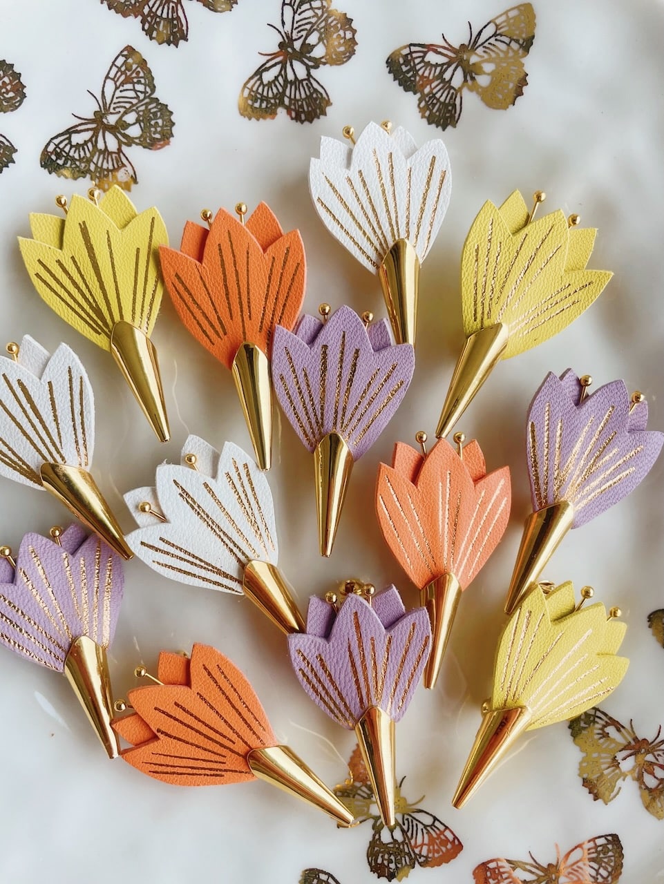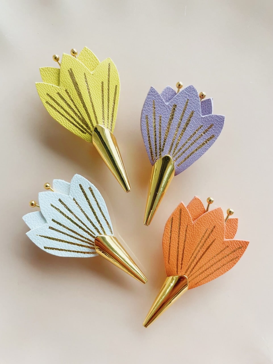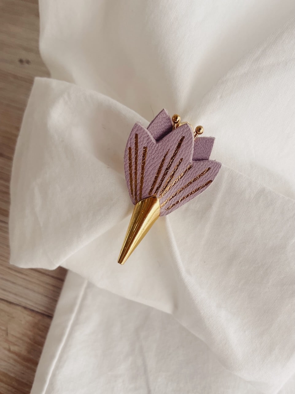 Cette jolie broche fleur de crocus, aussi appelée fleur de safran, est annonciatrice des beaux jours car elle fait partie des premières vivaces à fleurir avant le printemps. Avec ses nervures dorées à chaud à l’or véritable c’est un ravissant bijou floral en cuir surcyclé (upcyclé). Elle est confectionnée de façon artisanale par mes soins dans mon atelier sur la terre des 2 caps (côte d’opale en France). Chaque corolle est minutieusement découpée à la main et chaque fleur est ensuite ennoblie avec un procédé traditionnel de dorure à chaud à la main. Chaque pièce est donc unique. Elle est réalisée à partir d’excédents et chutes de cuir dans une démarche responsable de valorisation des matières premières (upcycling). Il s’agit de cuir d’ovins de provenance française (cuir blanc, jaune, noir) et européenne (cuir lilas, orange). Le fermoir en laiton est doré à l’or fin à Paris, le fourreau et les étamines fabriqués en Europe. Comme il s’agit de chutes de cuir, les coloris peuvent varier légèrement. Egalement déclinée en boucles d’oreilles. Cette broche fleur est délicate, prenez en soin. Pour la conserver longtemps, éviter toutes éclaboussures ou exposition à l’humidité, aux solvants, parfums et cosmétiques. Pensez à la retirer chaque fois que vous ôtez votre vêtement et veillez à la ranger séparément à l’abri de la lumière, de la poussière et de l’humidité, dans une boîte plutôt qu’à l’air libre en attendant de la porter de nouveau. Pour préserver la préciosité issue du travail à la main, cet accessoire d’exception doit être manipulé avec précaution Pour en savoir plus concernant le processus de fabrication, mon engagement et les valeurs de la marque, cliquez ici