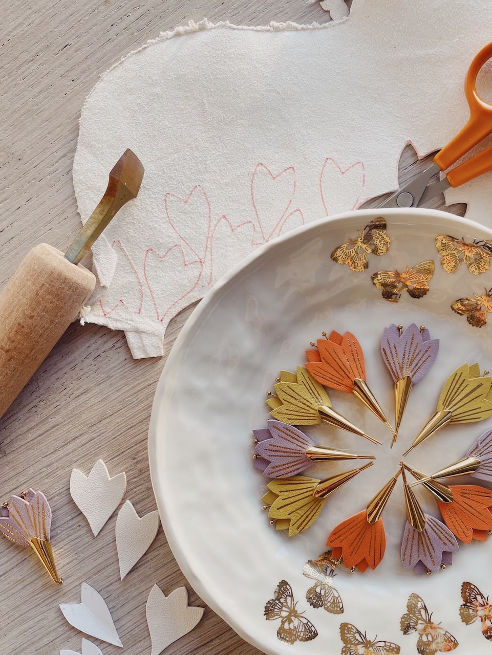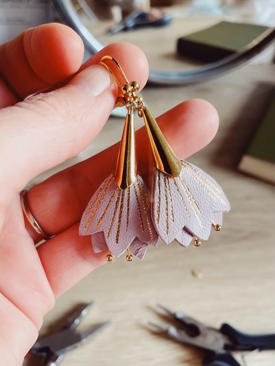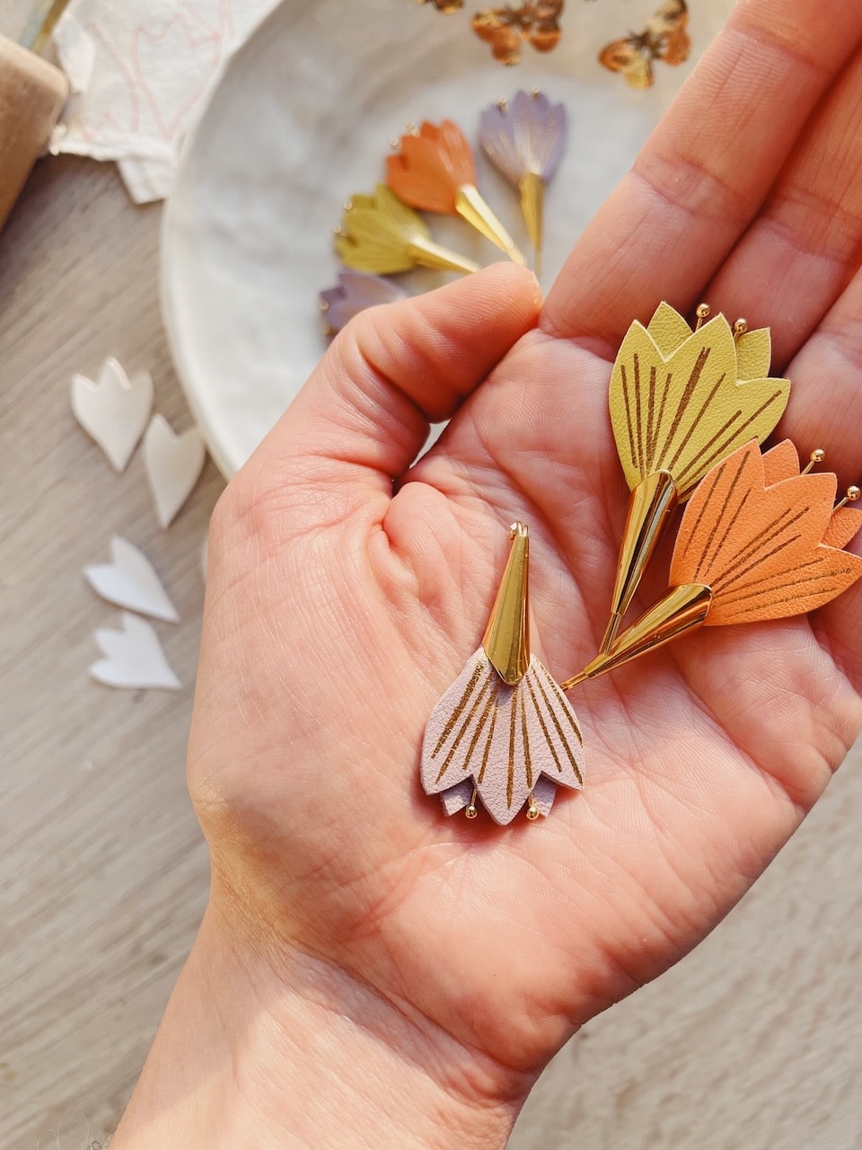 Cette jolie broche fleur de crocus, aussi appelée fleur de safran, est annonciatrice des beaux jours car elle fait partie des premières vivaces à fleurir avant le printemps. Avec ses nervures dorées à chaud à l’or véritable c’est un ravissant bijou floral en cuir surcyclé (upcyclé). Elle est confectionnée de façon artisanale par mes soins dans mon atelier sur la terre des 2 caps (côte d’opale en France). Chaque corolle est minutieusement découpée à la main et chaque fleur est ensuite ennoblie avec un procédé traditionnel de dorure à chaud à la main. Chaque pièce est donc unique. Elle est réalisée à partir d’excédents et chutes de cuir dans une démarche responsable de valorisation des matières premières (upcycling). Il s’agit de cuir d’ovins de provenance française (cuir blanc, jaune, noir) et européenne (cuir lilas, orange). Le fermoir en laiton est doré à l’or fin à Paris, le fourreau et les étamines fabriqués en Europe. Comme il s’agit de chutes de cuir, les coloris peuvent varier légèrement. Egalement déclinée en boucles d’oreilles. Cette broche fleur est délicate, prenez en soin. Pour la conserver longtemps, éviter toutes éclaboussures ou exposition à l’humidité, aux solvants, parfums et cosmétiques. Pensez à la retirer chaque fois que vous ôtez votre vêtement et veillez à la ranger séparément à l’abri de la lumière, de la poussière et de l’humidité, dans une boîte plutôt qu’à l’air libre en attendant de la porter de nouveau. Pour préserver la préciosité issue du travail à la main, cet accessoire d’exception doit être manipulé avec précaution Pour en savoir plus concernant le processus de fabrication, mon engagement et les valeurs de la marque, cliquez ici