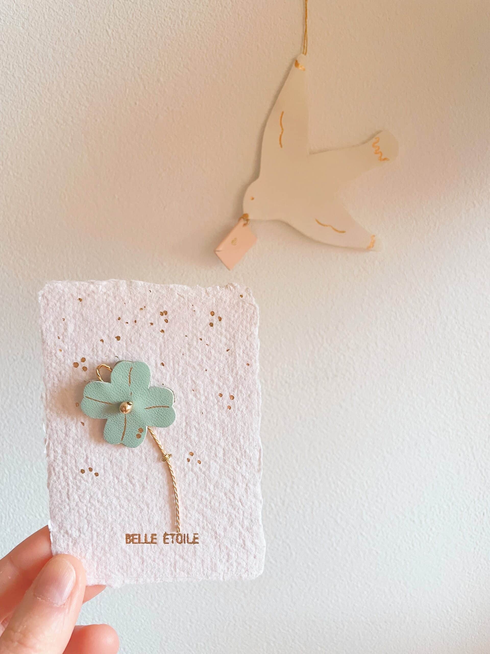 Commencez l’année sous de bons auspices avec le trèfle à quatre feuilles ‘Bonne Année’, un véritable grigri protecteur conçu pour porter chance et sérénité à son heureux destinataire. Ce trèfle en cuir vert amande, travaillé à la main avec des nervures et gouttes de rosée en dorure à chaud à l’or véritable, est enrichi de perles de laiton doré minutieusement brodées et d’une tige en laiton torsadé. Une petite anse discrète permet de l’accrocher facilement dans la maison, sur un simple clou ou suspendu à un fil, pour qu’il veille sur le foyer. Présenté sur une carte en papier artisanal français, ornée d’une inscription en lettres dorées et d’un délicat décor de pois dorés évoquant un souffle de pollen, il est à la fois un cadeau durable et une décoration poétique. Polyvalent, ce trèfle peut également se glisser dans un porte-carte, un livre ou un carnet, comme on le fait parfois pour conserver précieusement un véritable trèfle à quatre feuilles, et l’emporter partout avec soi.