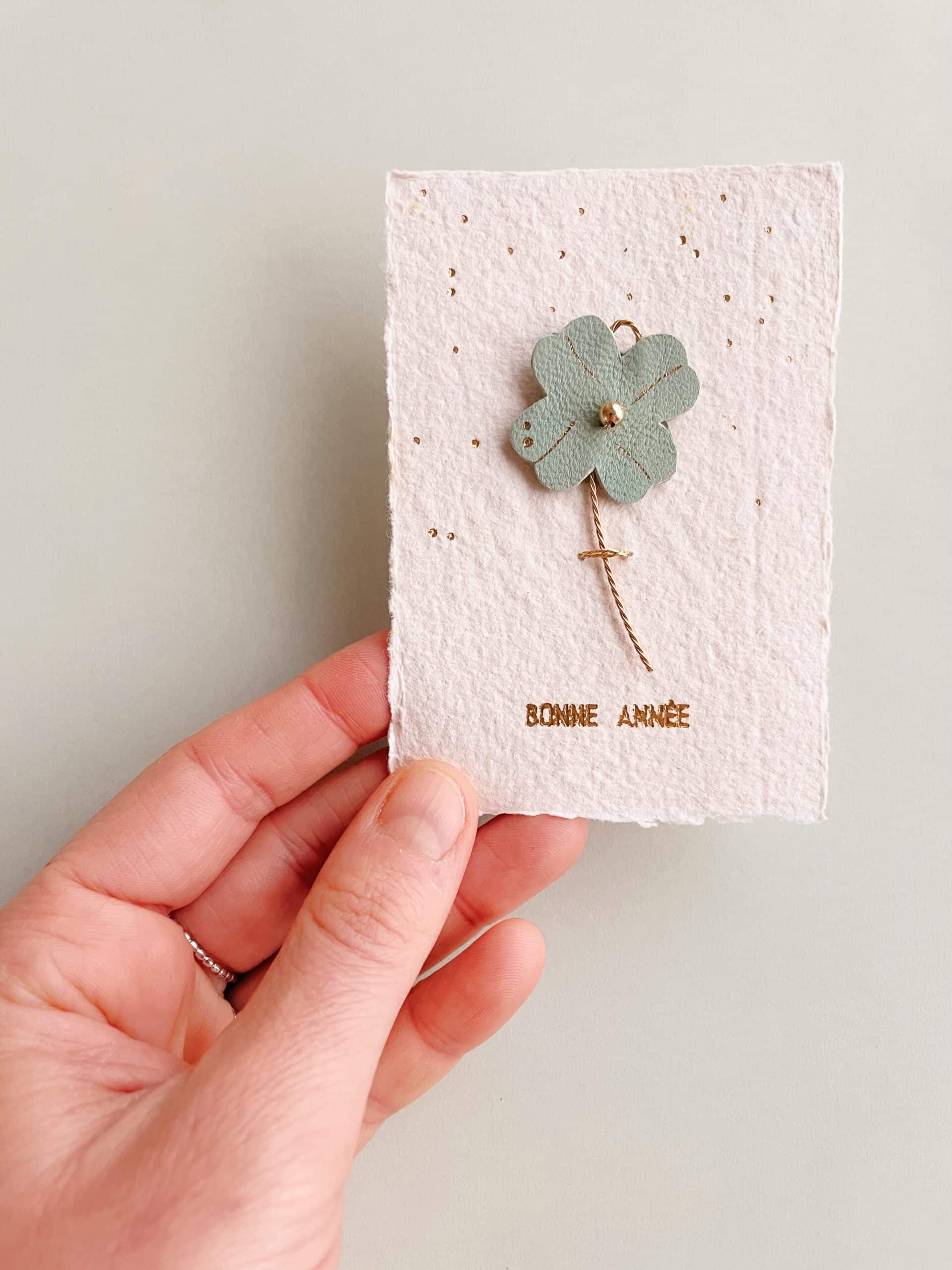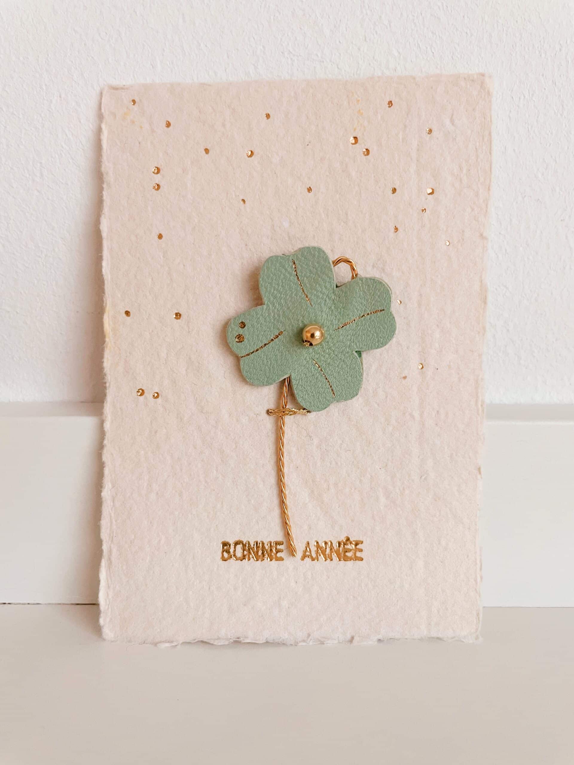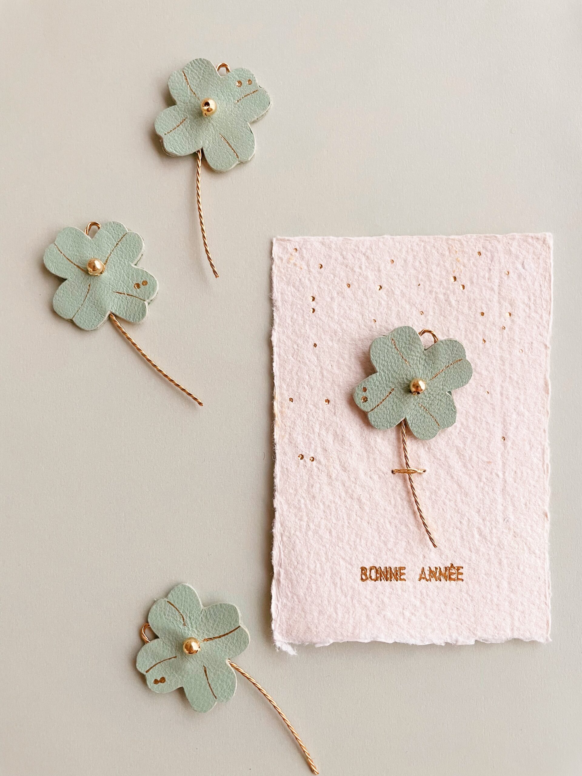 Des fleurs plutôt qu’un long discours – Fleur 3 cm / hauteur totale 8 cm environ / carte 7 x 10 cm. Trèfle à quatre feuilles « porte-bonheur » en cuir upcyclé, dorure à chaud à l’or fin, tige en laiton torsadé, perle de laiton doré or fin et sa carte en papier artisanal avec marquage en lettres d’or « Bonne année ». Edition limitée 6 pièces uniques, puis autres modèles avec lettrage personnalisé sur commande pour célébrer une occasion spéciale ou transmettre un message particulier.