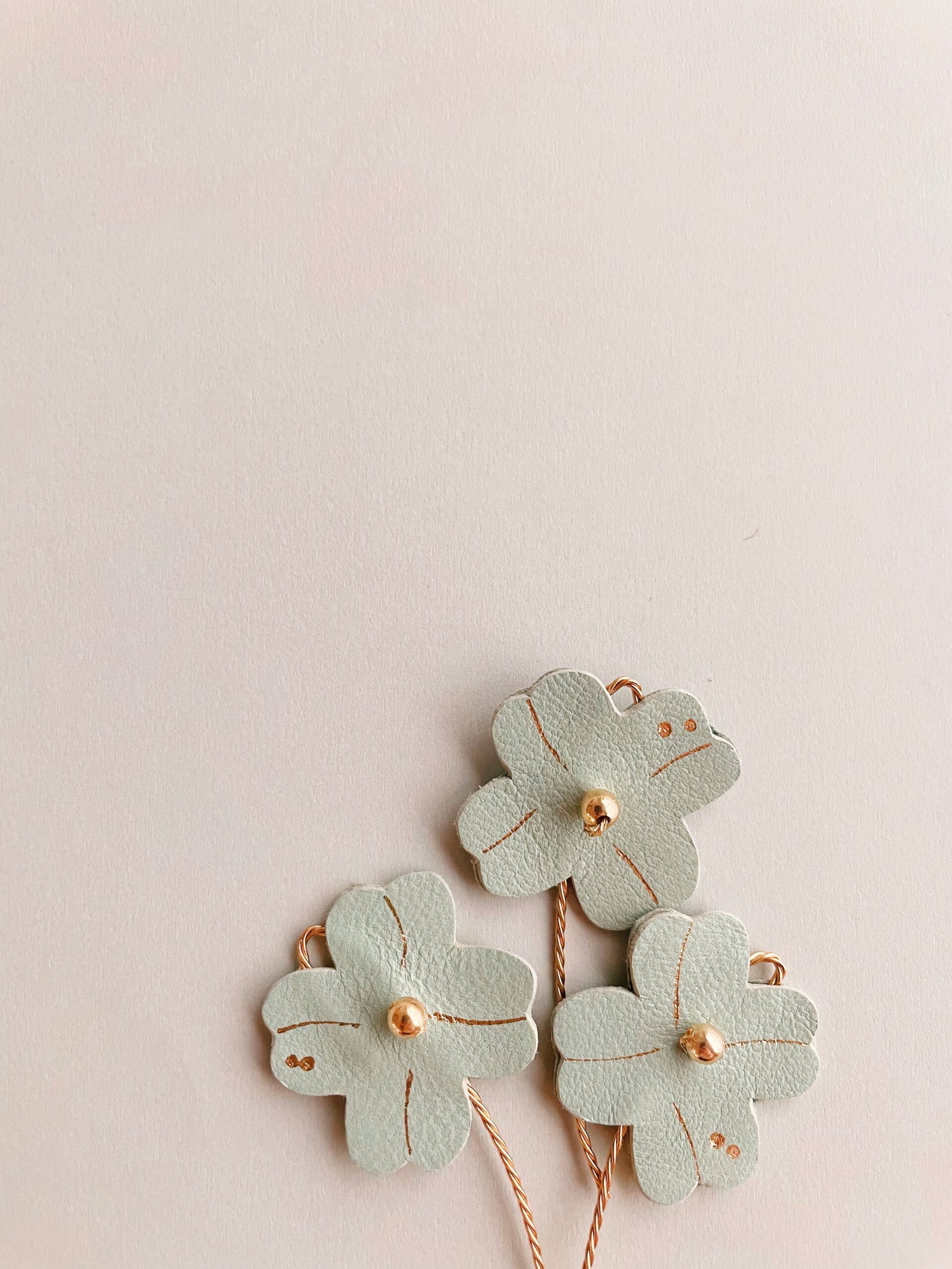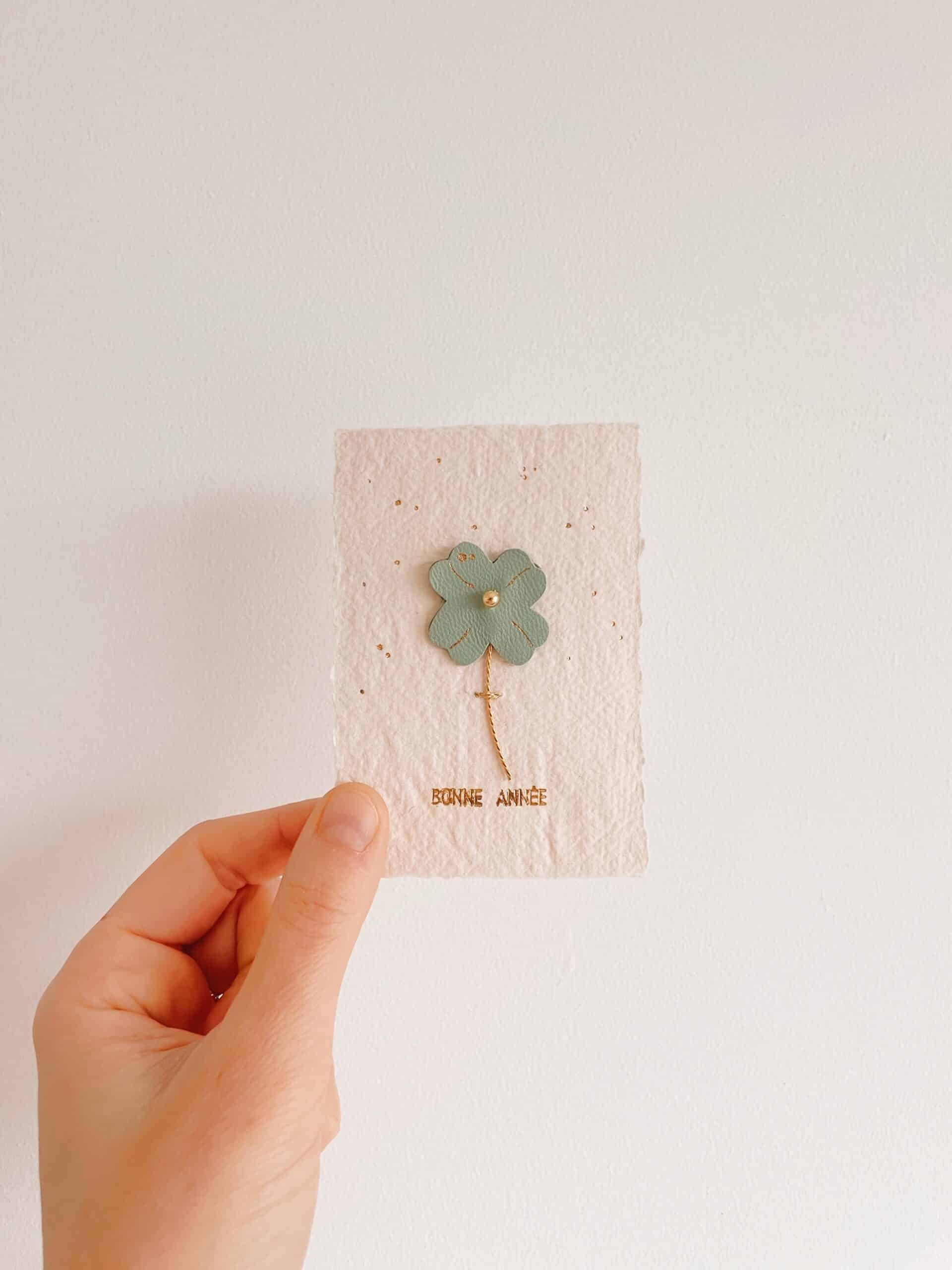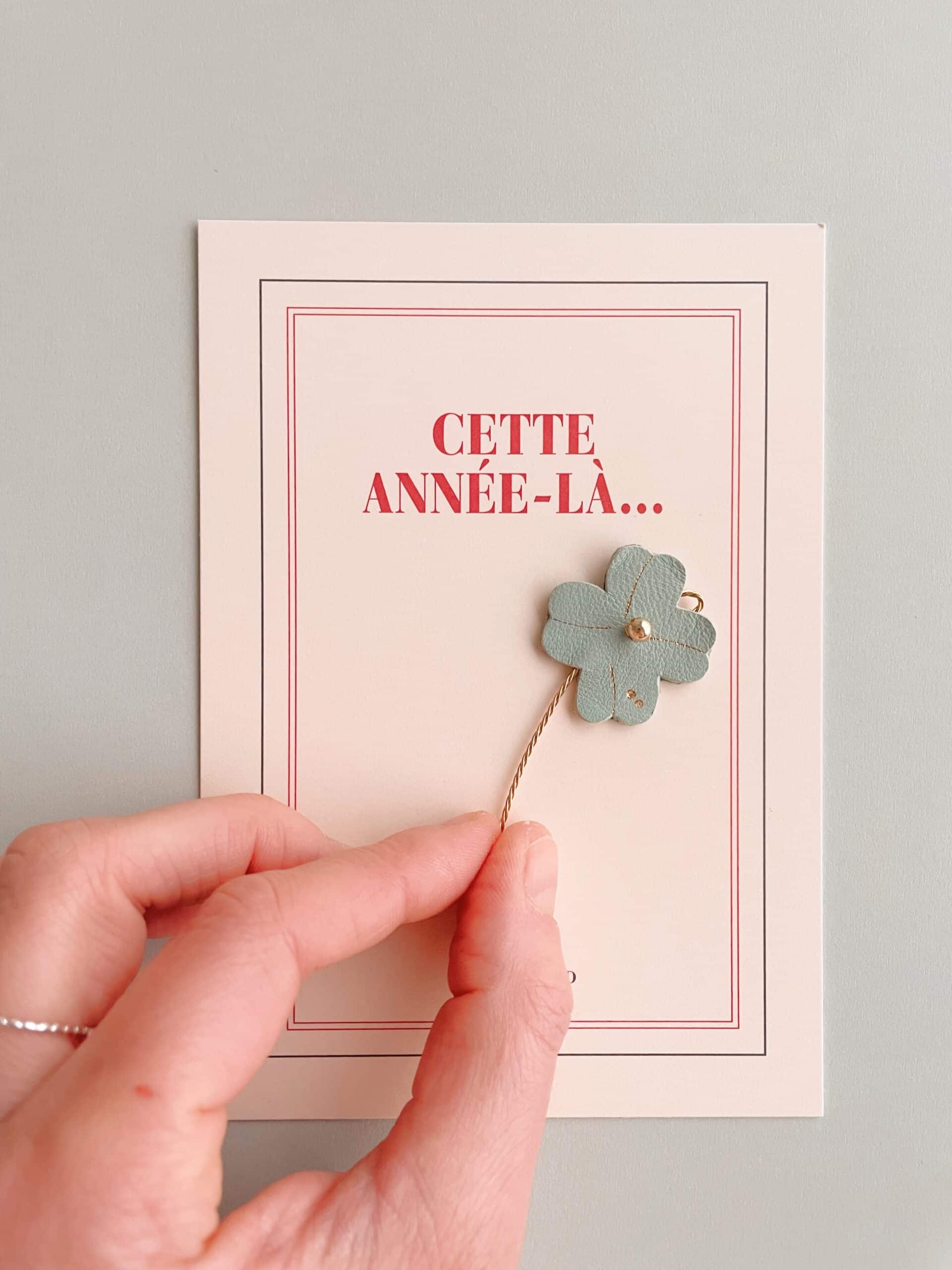 Des fleurs plutôt qu’un long discours – Fleur 3 cm / hauteur totale 8 cm environ / carte 7 x 10 cm. Trèfle à quatre feuilles « porte-bonheur » en cuir upcyclé, dorure à chaud à l’or fin, tige en laiton torsadé, perle de laiton doré or fin et sa carte en papier artisanal avec marquage en lettres d’or « Bonne année ». Edition limitée 6 pièces uniques, puis autres modèles avec lettrage personnalisé sur commande pour célébrer une occasion spéciale ou transmettre un message particulier.