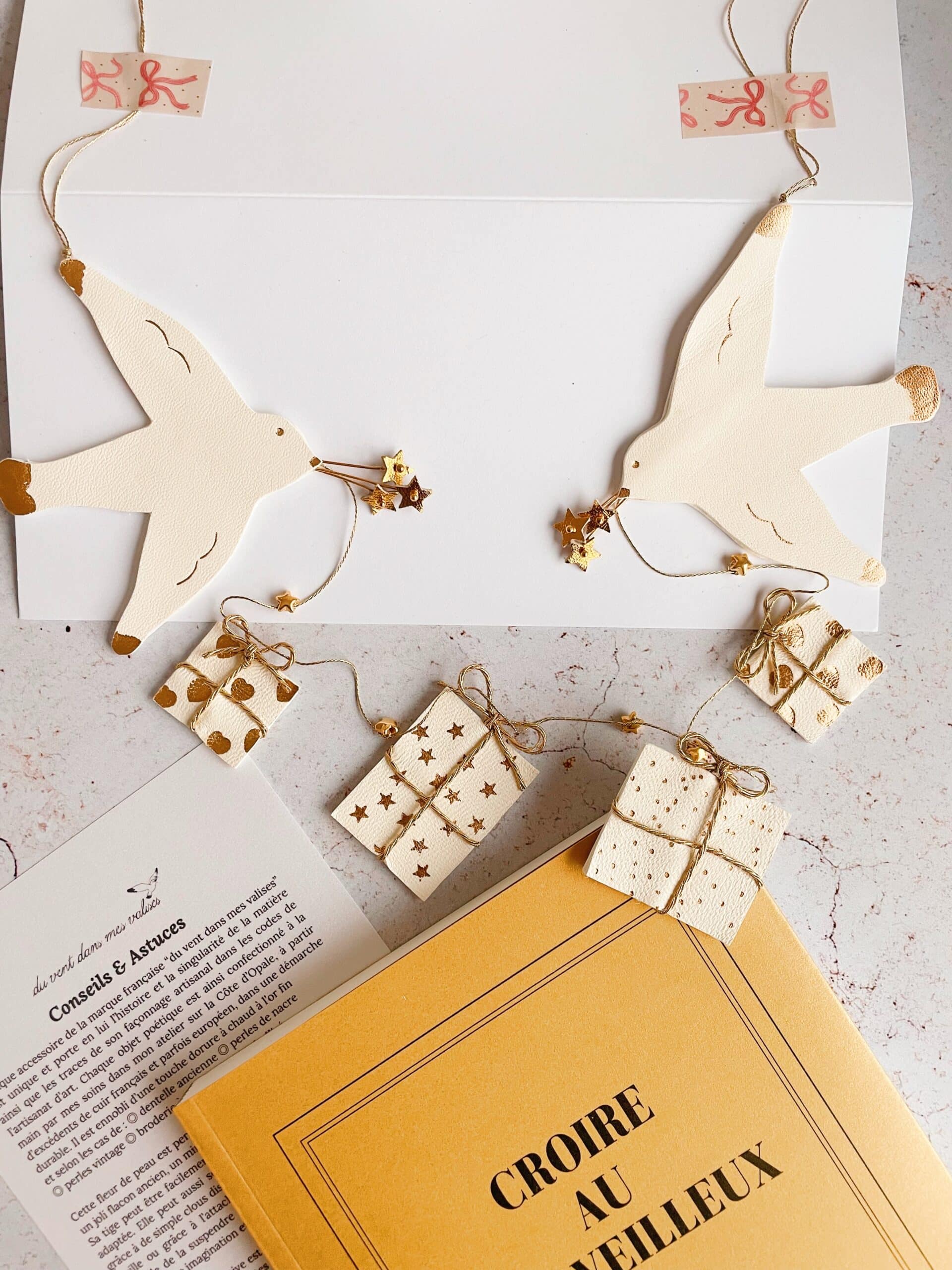 Cette ribambelle L’Esprit de Noël est une parure de fête, un bijou d’intérieur pensé pour célébrer la magie des traditions et l’éclat des étoiles qu’on rallume en décembre. Deux mouettes élégantes, comme des messagères d’un Noël enchanté, tiennent dans leur bec un bouquet d’étoiles dorées, promesse de souhaits bienveillants. Derrière elles, une ribambelle de quatre petits cadeaux en cuir ivoire, ornés de dorures à chaud, rappelle avec poésie l’attente des fêtes et le partage des présents. Façonnée à la main, chaque exemplaire est unique et inspire un clin d’œil féérique à l’univers marin de la marque.