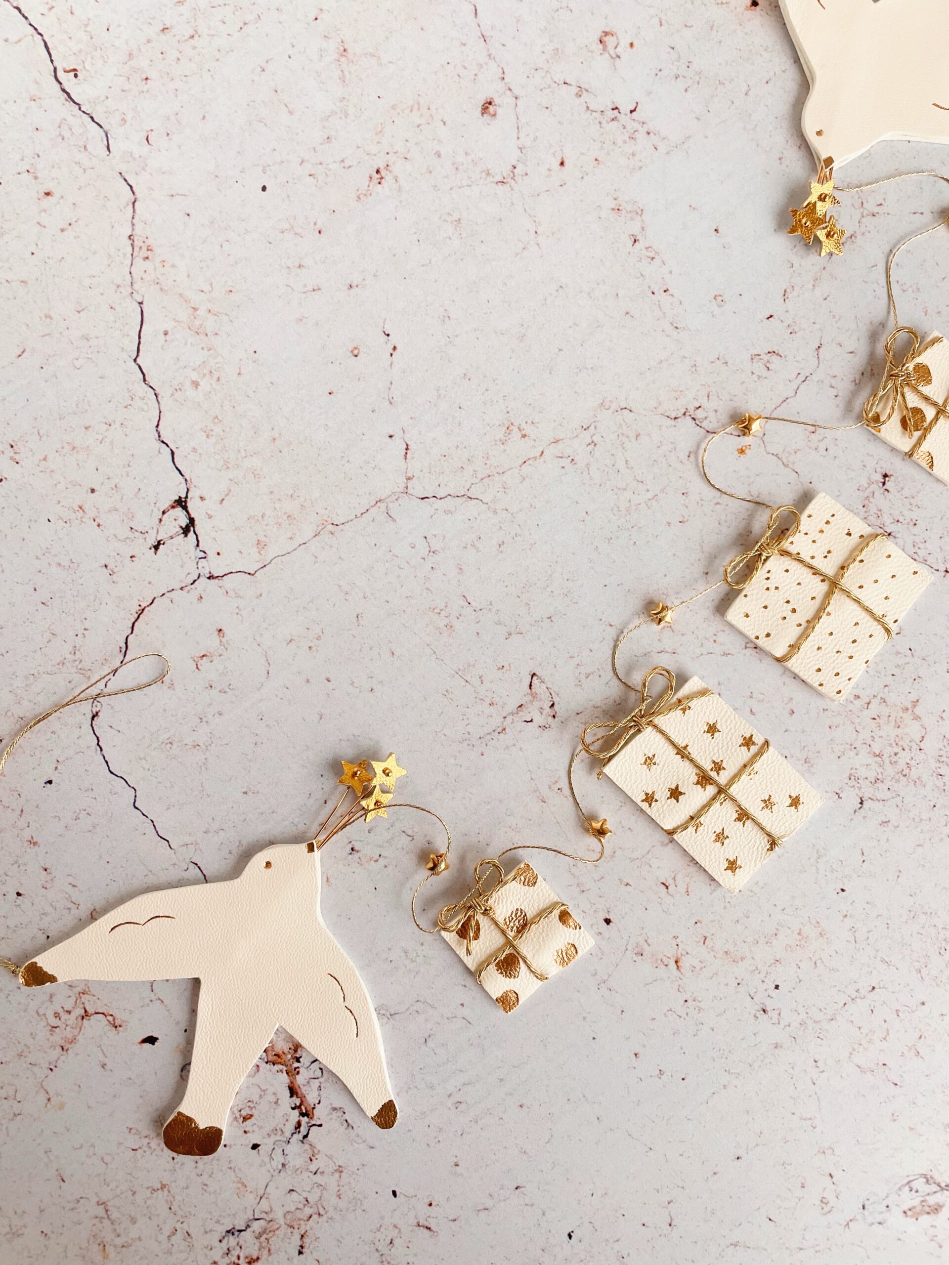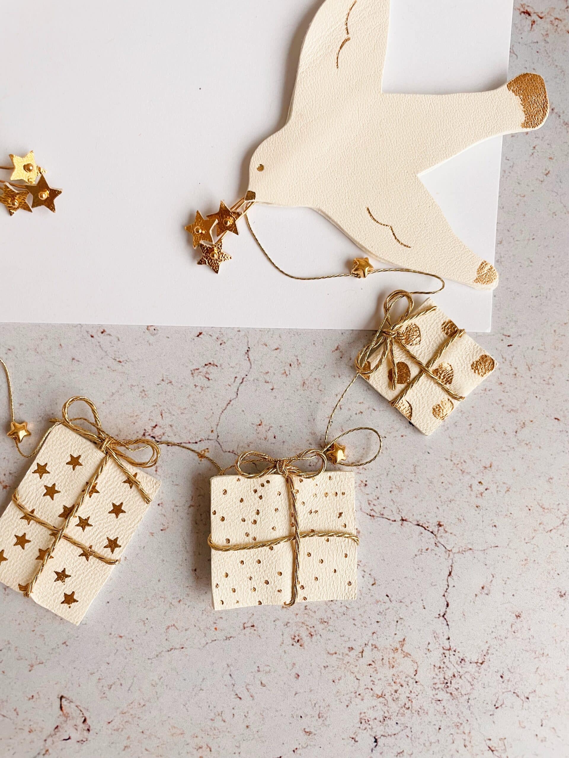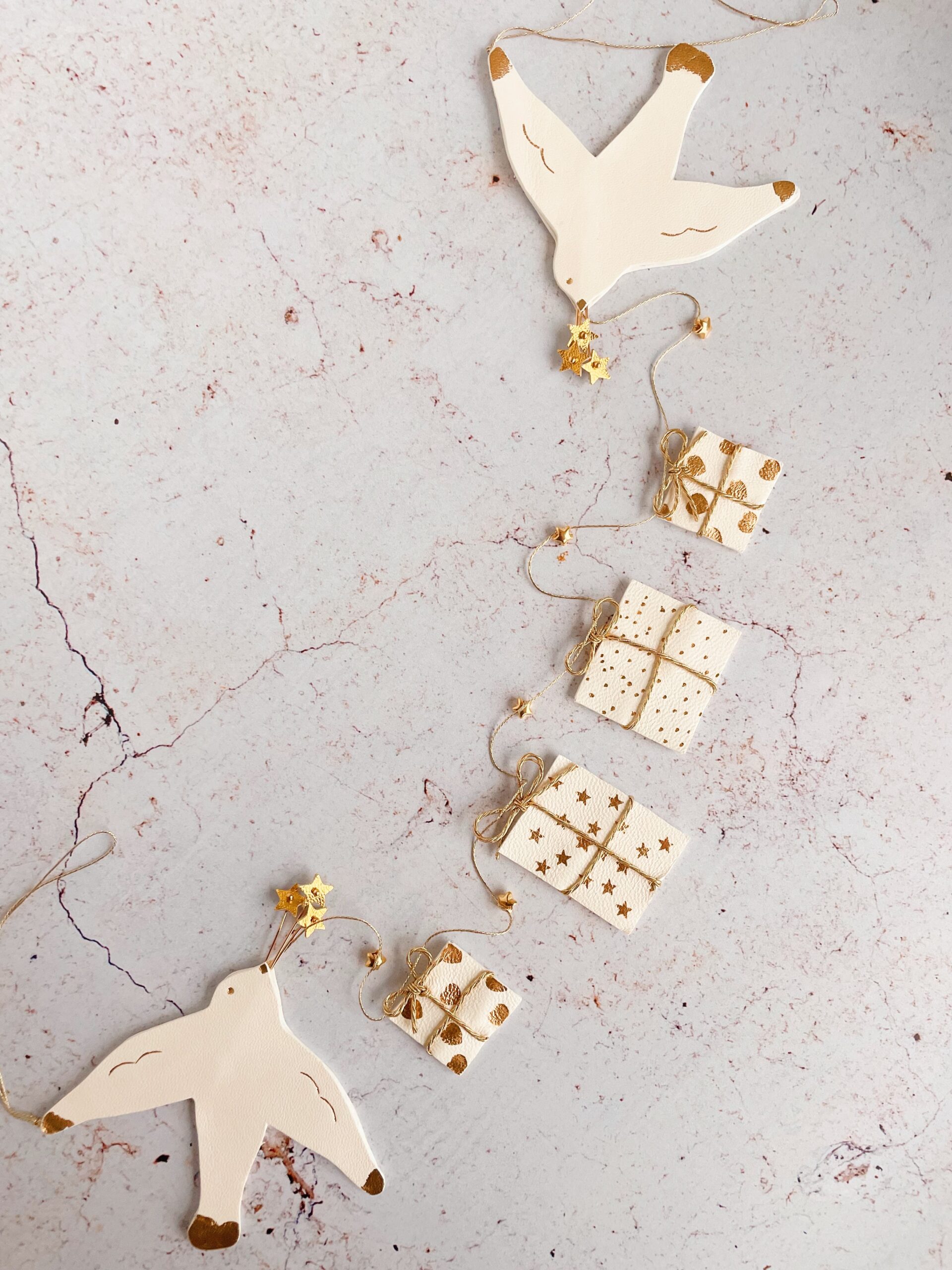 Ornement décoratif ou bijou mural – modèle L’esprit de Noël. Oiseaux blancs (mouettes), étoiles dorées et cadeaux blancs avec détails dorés sur fil métallisé doré. Cuir surcyclé, dorure à chaud à l’or véritable. Dimensions : 40 cm d’une boucle à l’autre, mouette environ 9 cm, cadeaux 3 à 5 cm selon les motifs .Fournie avec 2 clous dorés. Pièces uniques.