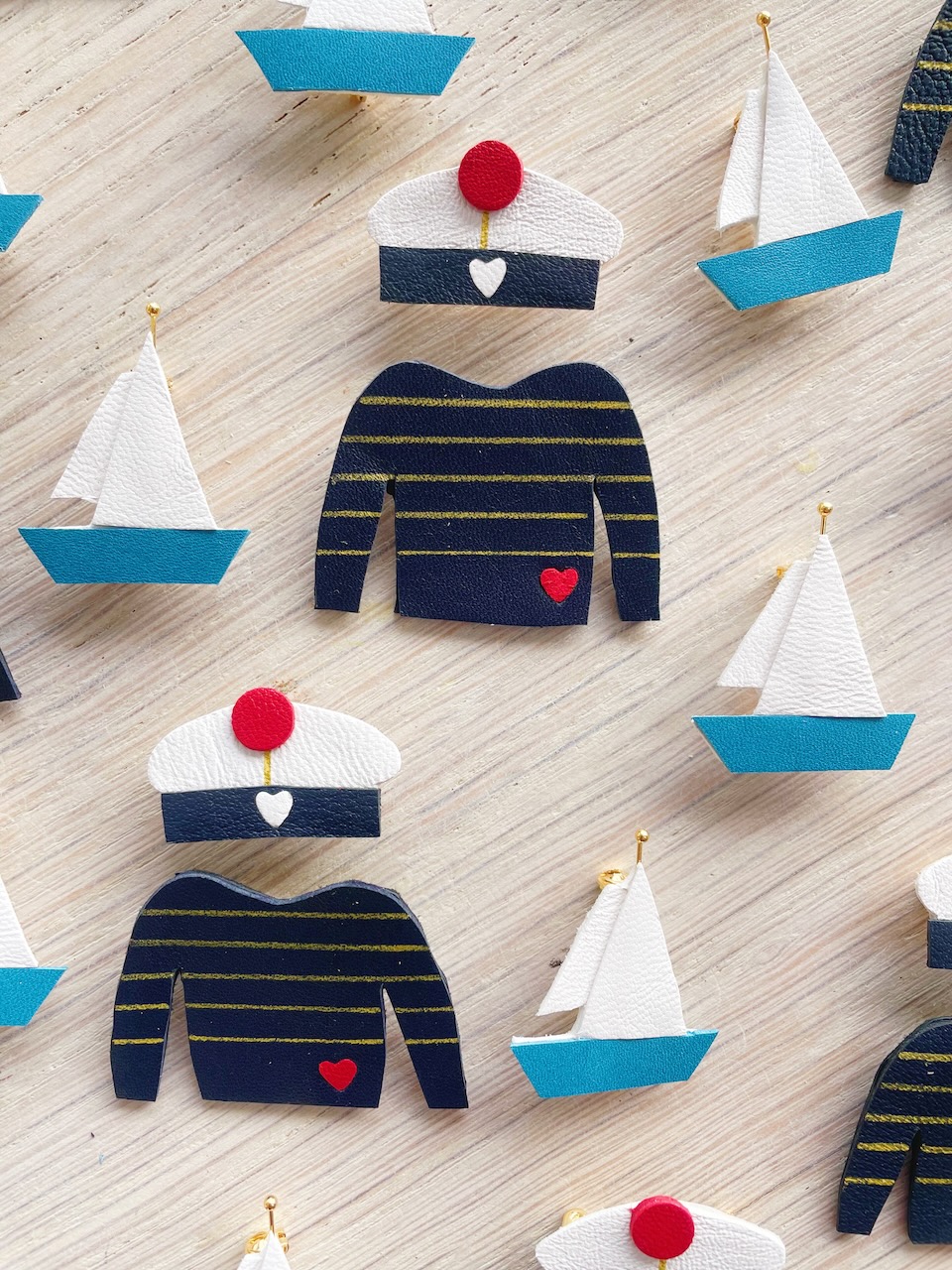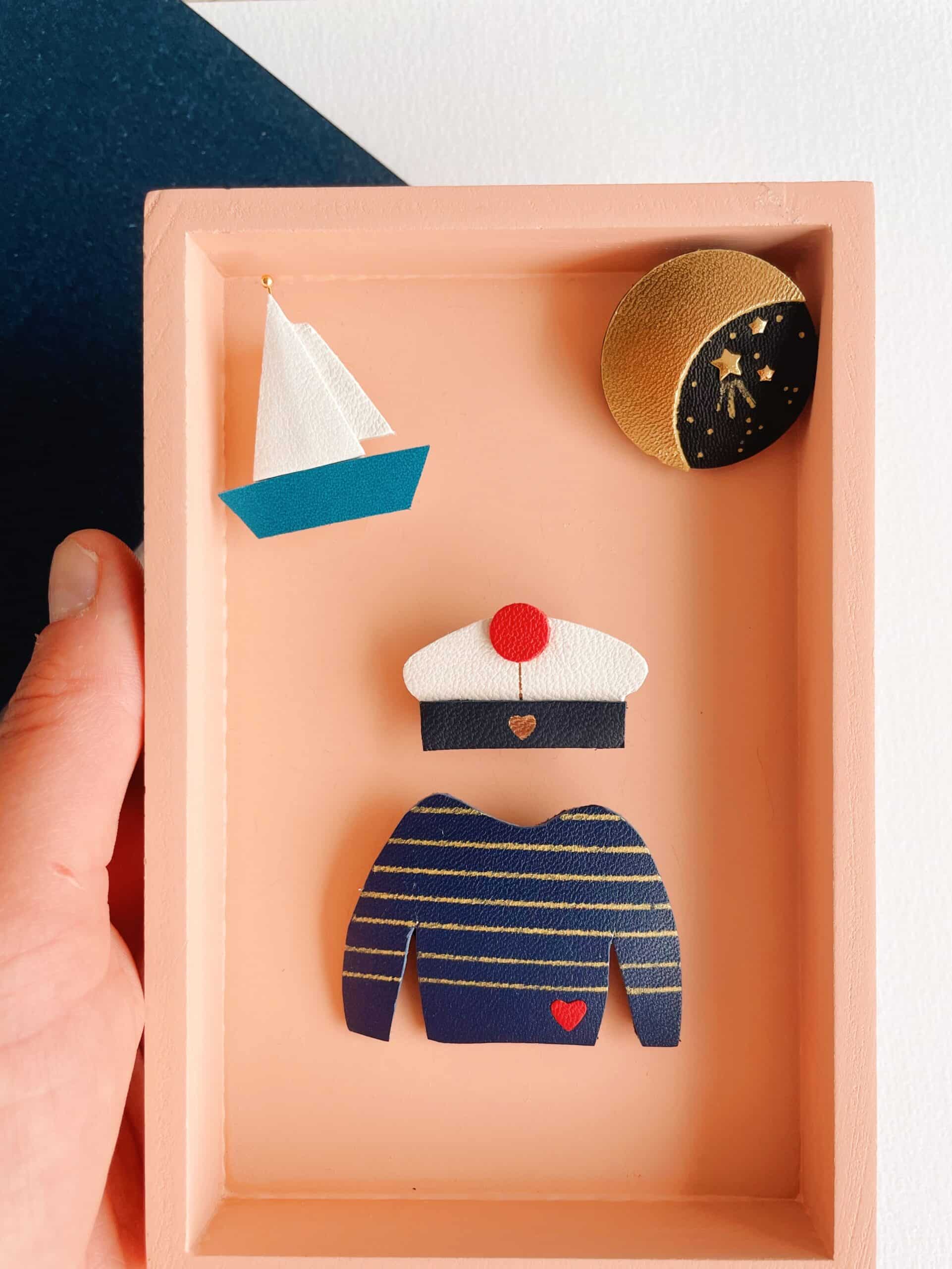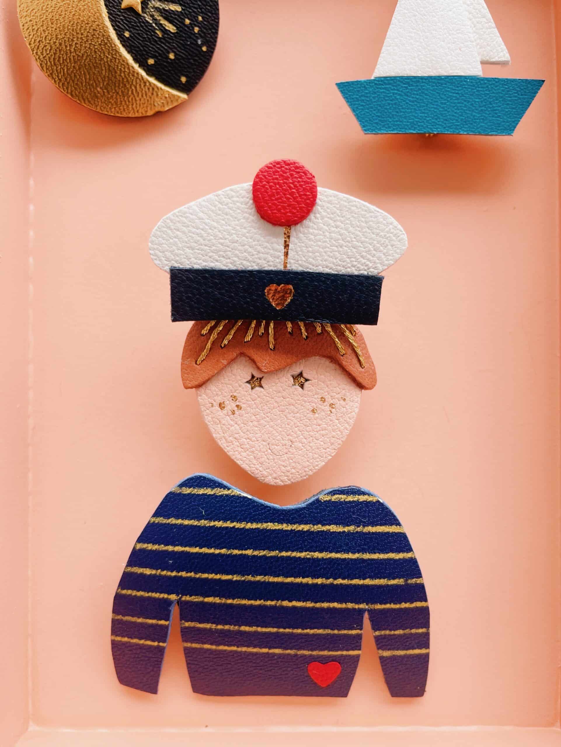 Des broches bijoux en cuir upcyclé pour une touche de poésie iodée au quotidien. Cette jolie broche se présente sous forme d’une adorable marinière bleu marine ou blanc cassé soigneusement découpée main et rehaussée de rayures à la peinture dorée. Chaque modèle est donc unique et peut sur demande être personnalisé avec des initiales, un monogramme.