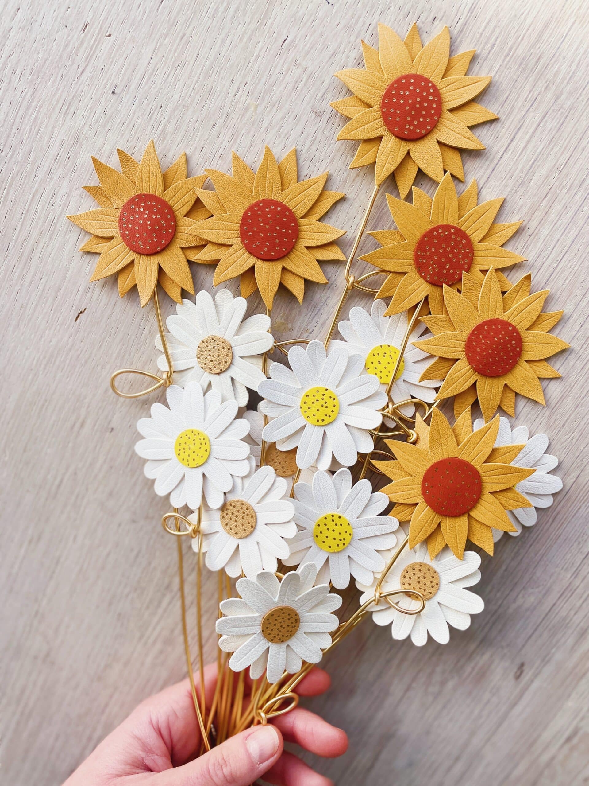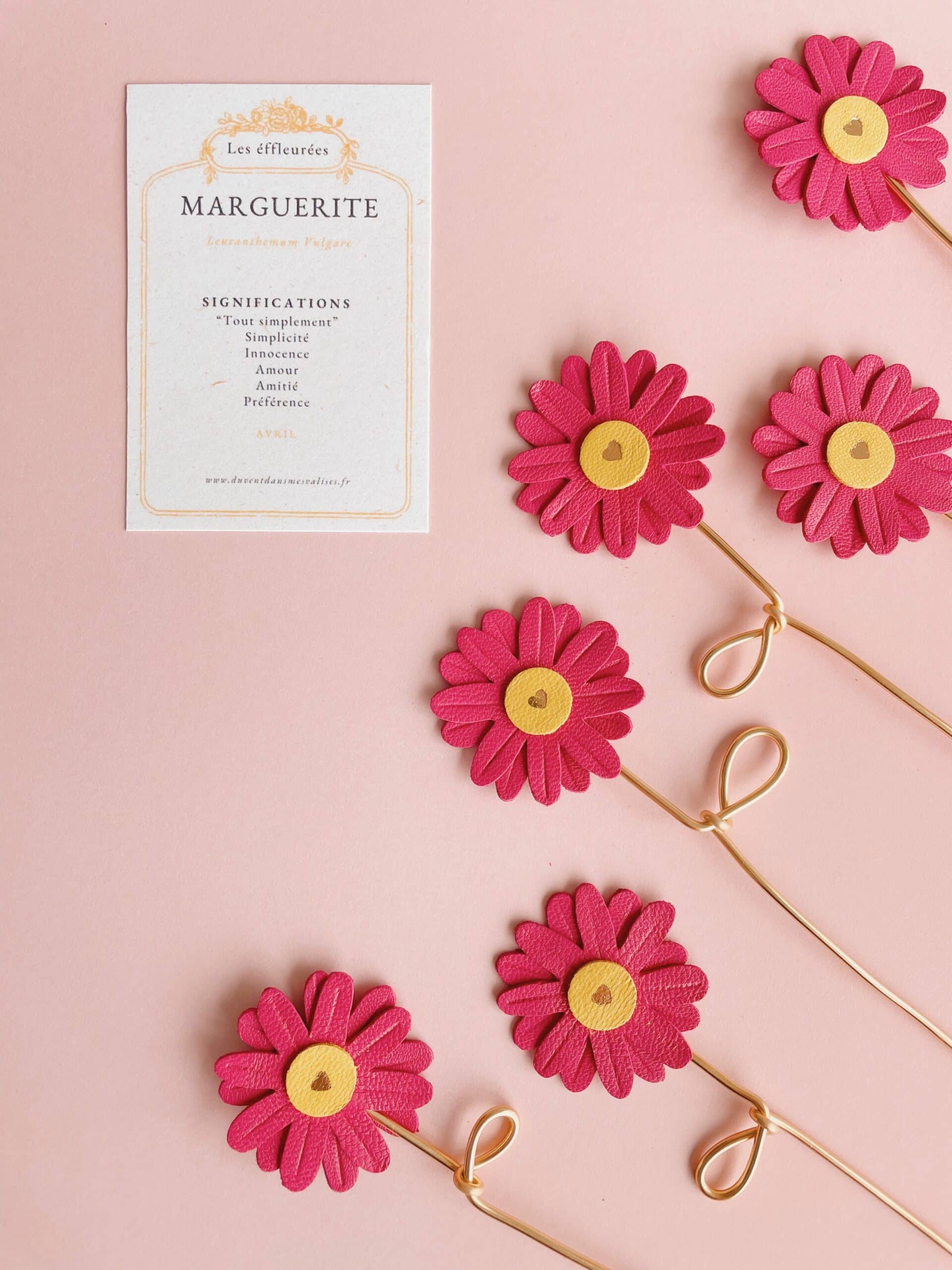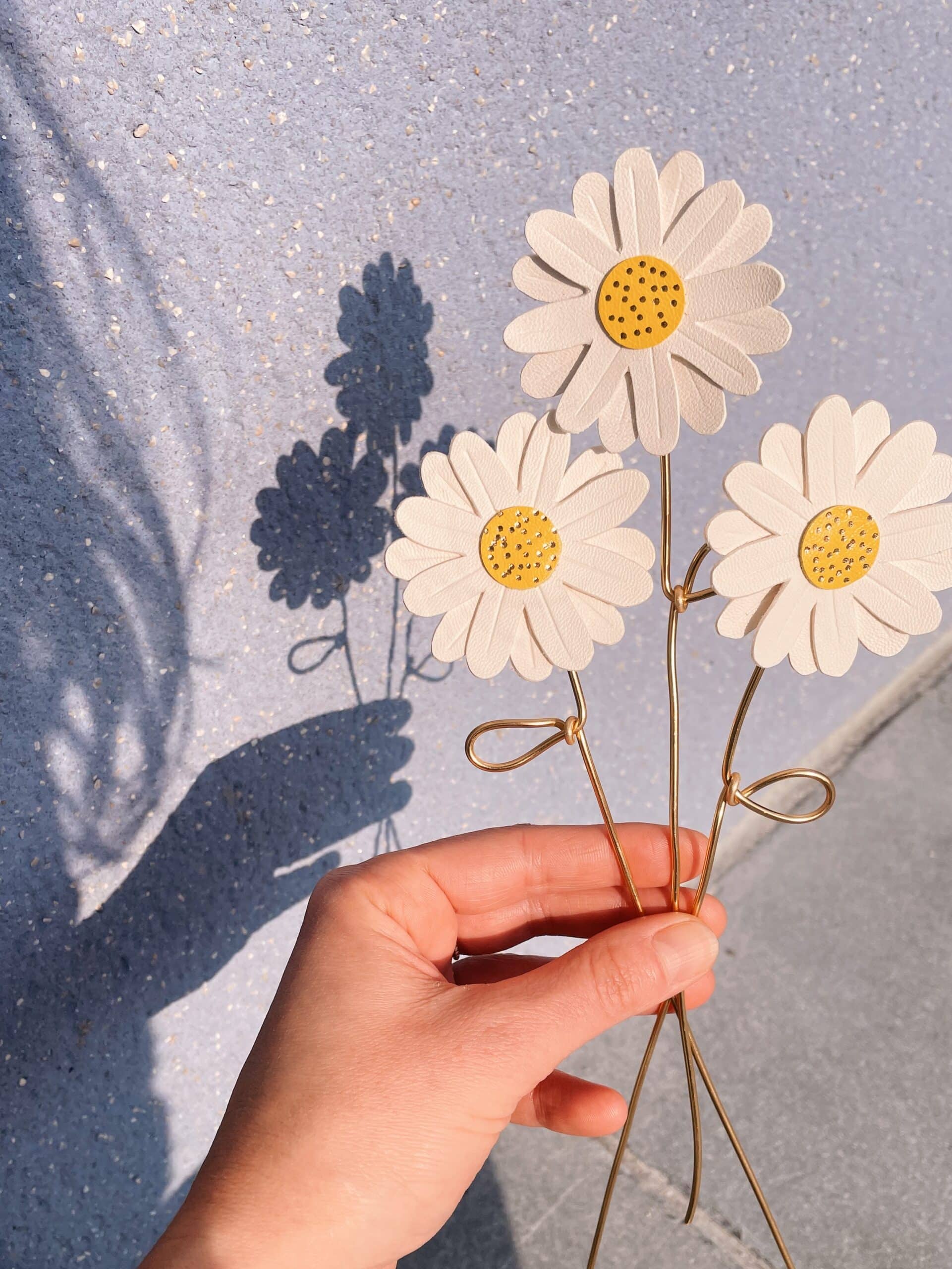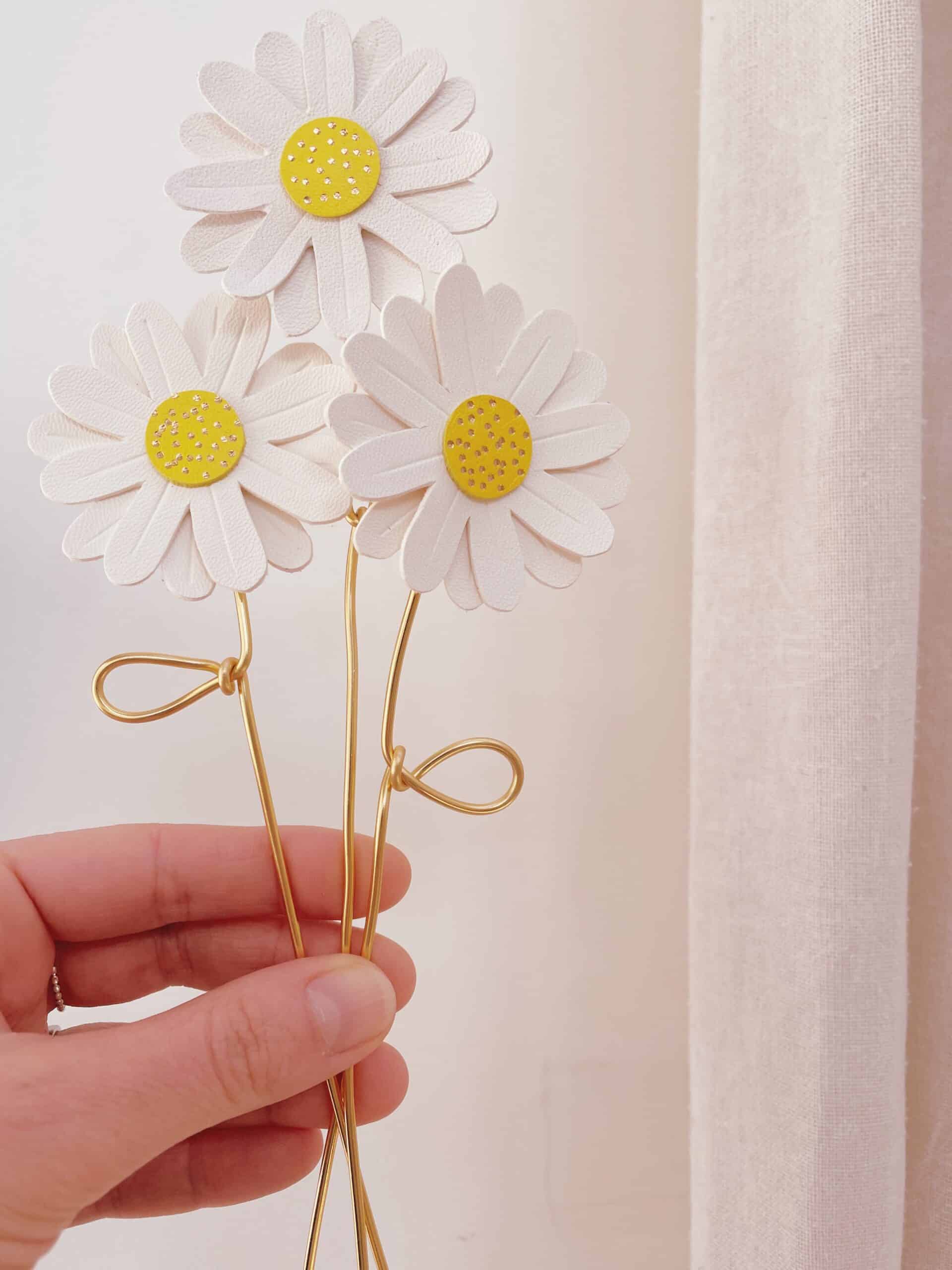 Cette jolie fleur de marguerite est de celle dont la beauté ne fane jamais. Elégante et robuste, elle fait partie de la collection des « effleurées », fleurs françaises à la tige en cuir upcyclé / surcyclé (revalorisation d’excédents de tannerie dans une démarche responsable d’utilisation des matières premières, « upcycling »). Durables et légères, elles sont minutieusement découpées à partir de gabarits exclusifs fabriqués par la marque du vent dans mes valises. Pour plus de noblesse et de raffinement, les pétales et les coeurs de fleurs sont rehaussés de jolis détails ( marquage à froid et/ou dorure à chaud à la main). Ces spécimens éclosent dans mon atelier d’artisan métier d’art sur la terre des 2 caps (Côte d’opale en France). Chacune de ces fleurs est unique. La marguerite est réalisée à partir de cuir d’ovins de provenance française. La tige est façonnée par mes soins en aluminium de couleur dorée. Comme il s’agit de chutes de cuir, les coloris peuvent varier légèrement selon les morceaux utilisés. Cette fleur décorative est délicate, prenez en soin. Pour la conserver longtemps, éviter toutes éclaboussures ou exposition à l’humidité, aux solvants, parfums et cosmétiques. Lorsque vous ne l’utilisez pas, veillez à la ranger séparément à l’abri de la lumière, de la poussière et de l’humidité, dans une boîte plutôt qu’à l’air libre. Manipulez avec précaution. Pour en savoir plus concernant le processus de fabrication, mon engagement et les valeurs de la marque, cliquez ici