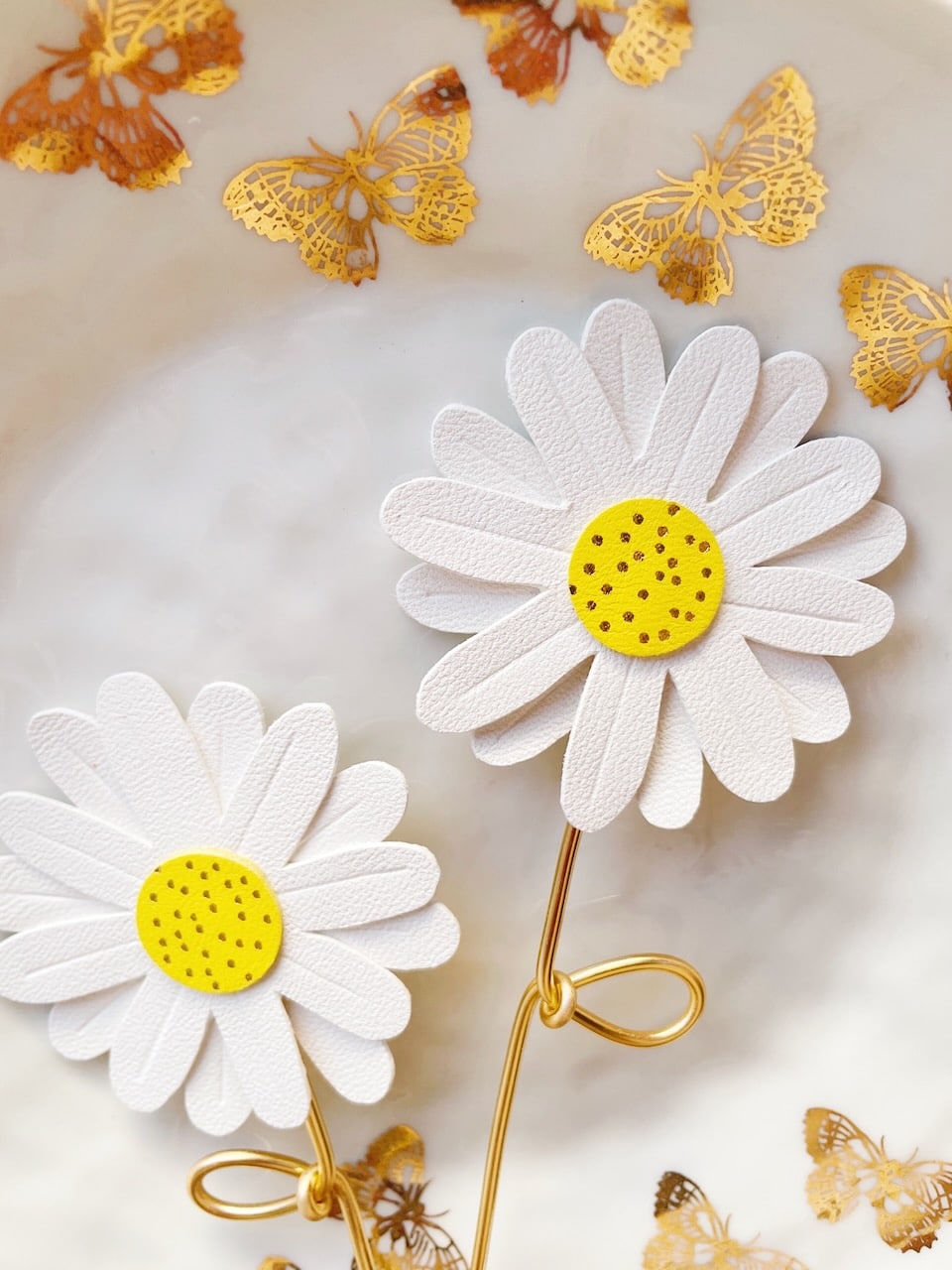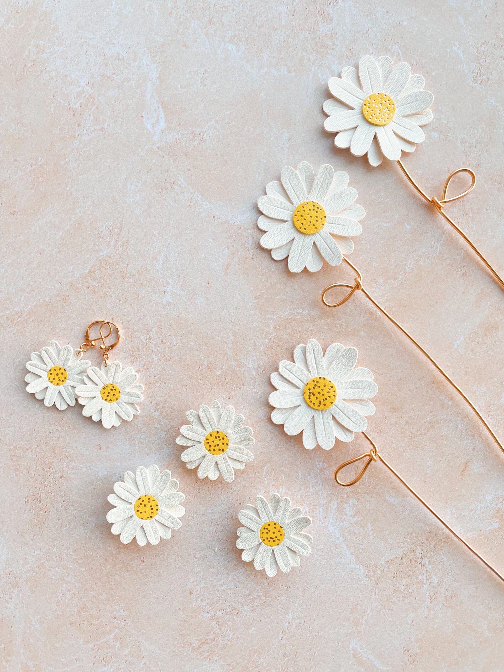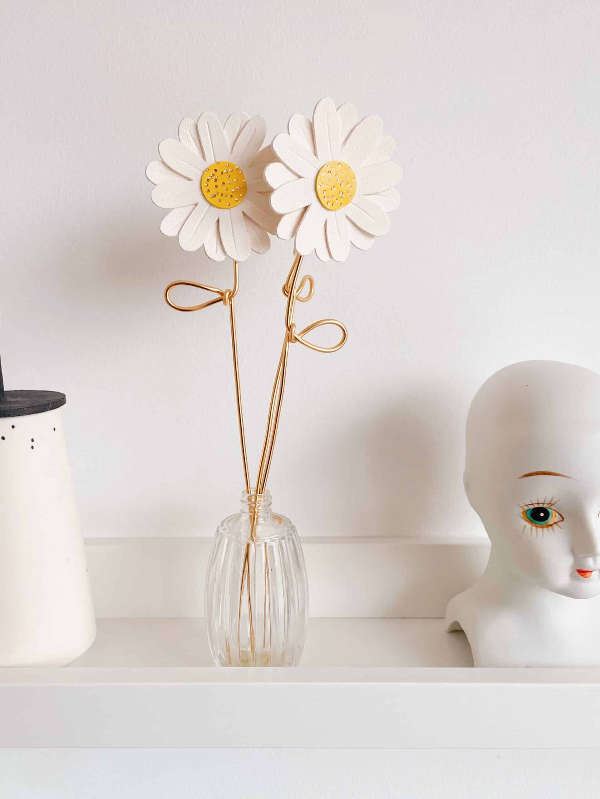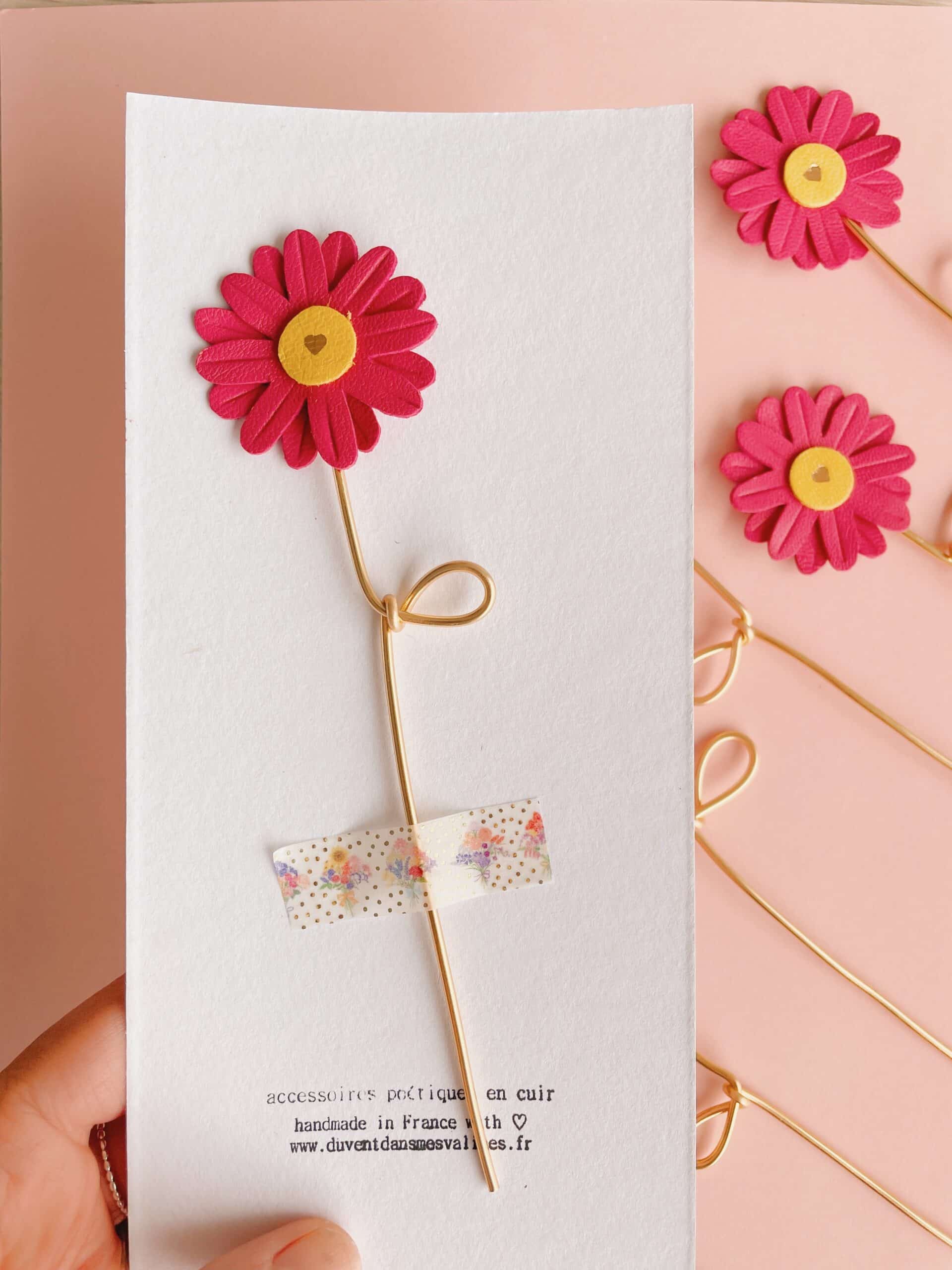Cette jolie fleur de marguerite est de celle dont la beauté ne fane jamais. Elégante et robuste, elle fait partie de la collection des « effleurées », fleurs françaises à la tige en cuir upcyclé / surcyclé (revalorisation d’excédents de tannerie dans une démarche responsable d’utilisation des matières premières, « upcycling »). Durables et légères, elles sont minutieusement découpées à partir de gabarits exclusifs fabriqués par la marque du vent dans mes valises. Pour plus de noblesse et de raffinement, les pétales et les coeurs de fleurs sont rehaussés de jolis détails ( marquage à froid et/ou dorure à chaud à la main). Ces spécimens éclosent dans mon atelier d’artisan métier d’art sur la terre des 2 caps (Côte d’opale en France). Chacune de ces fleurs est unique. La marguerite est réalisée à partir de cuir d’ovins de provenance française. La tige est façonnée par mes soins en aluminium de couleur dorée. Comme il s’agit de chutes de cuir, les coloris peuvent varier légèrement selon les morceaux utilisés. Cette fleur décorative est délicate, prenez en soin. Pour la conserver longtemps, éviter toutes éclaboussures ou exposition à l’humidité, aux solvants, parfums et cosmétiques. Lorsque vous ne l’utilisez pas, veillez à la ranger séparément à l’abri de la lumière, de la poussière et de l’humidité, dans une boîte plutôt qu’à l’air libre. Manipulez avec précaution. Pour en savoir plus concernant le processus de fabrication, mon engagement et les valeurs de la marque, cliquez ici