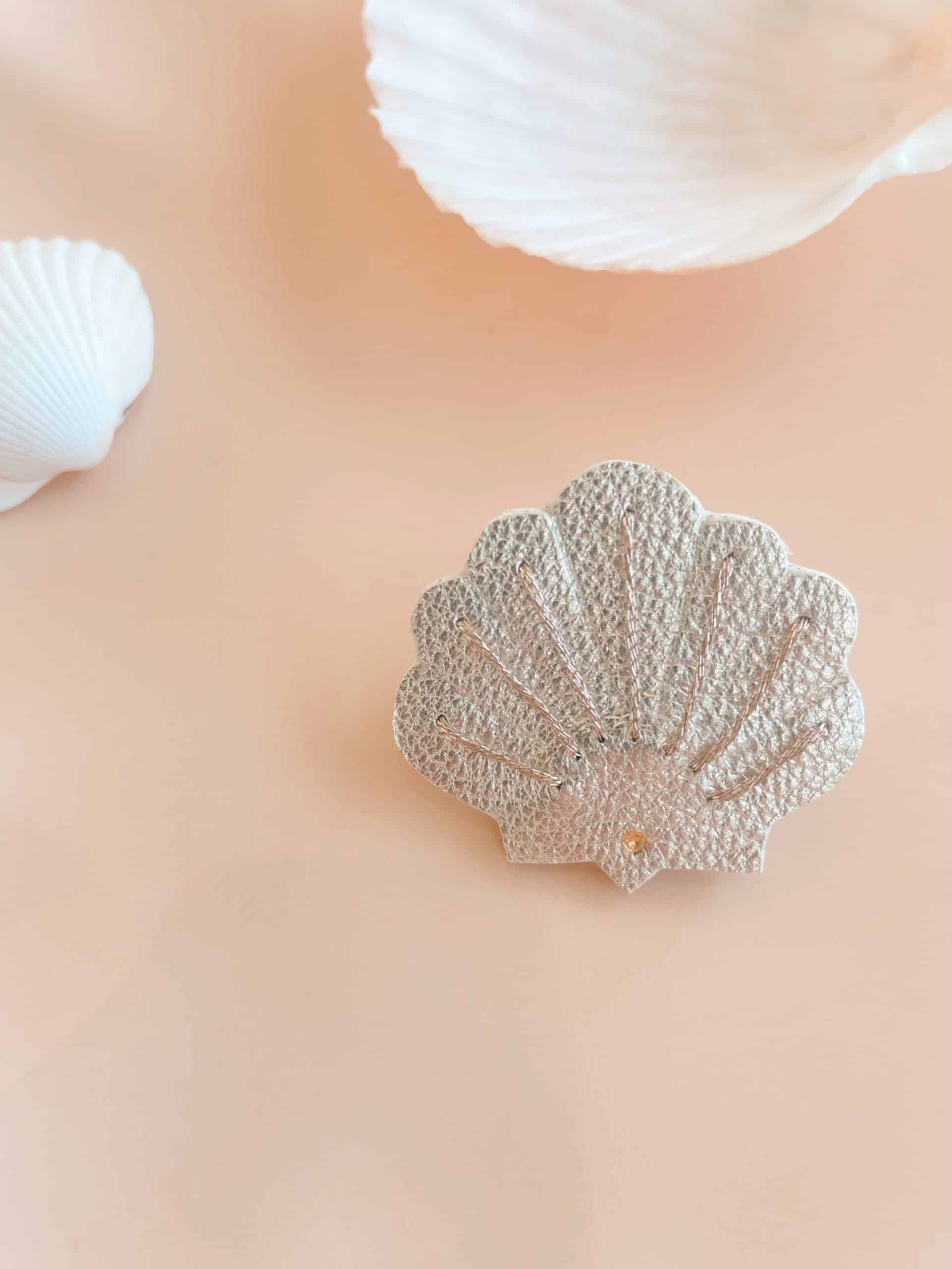 Cette broche intemporelle se présente sous forme d’un coquillage évoquant la symbolique coquille Saint Jacques. Conçue avec amour et délicatesse, c’est bien plus qu’un simple accessoire de mode durable. Fabriquée à partir de cuir upcyclé, brodée, marquée en creux et accentuée par une touche de dorure à l’or véritable, elle incarne à merveille l’élégance naturelle. Chaque coquille est découpée et travaillée à la main par mes soins, ce qui fait de chaque pièce une sorte de d’œuvre d’art miniature unique. Son fermoir en laiton doré à l’or fin lui confère une touche de sophistication supplémentaire. Qu’elle soit portée sur un t-shirt simple, une robe élégante, un chapeau ou un sac, cette broche apportera une note de poésie à votre tenue. C’est le cadeau parfait à s’offrir soi-même ou pour un être cher, comme un souvenir précieux glané avec attention en bord de mer. Associez lui d’autres broches cerf-volant ou cabines de plage, pour vous souvenir des belles choses, des petits plaisirs de vacances et des inoubliables moments de joie ! Pour en savoir plus concernant le processus de fabrication, mon engagement et les valeurs de la marque, cliquez ici