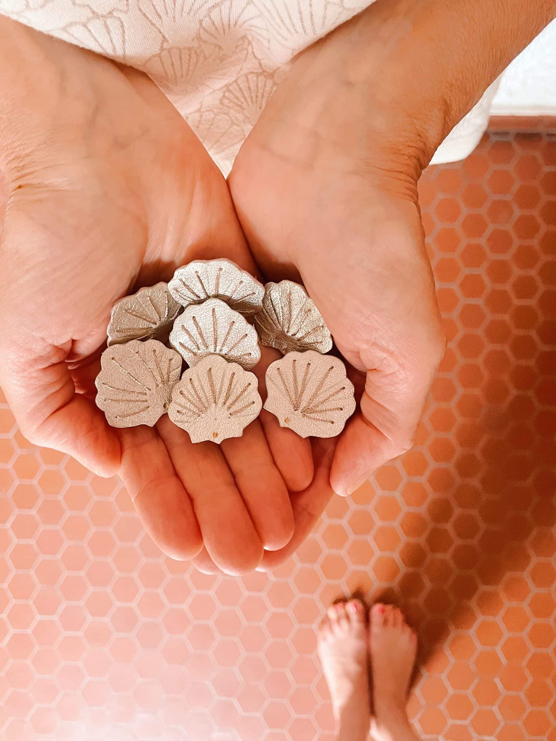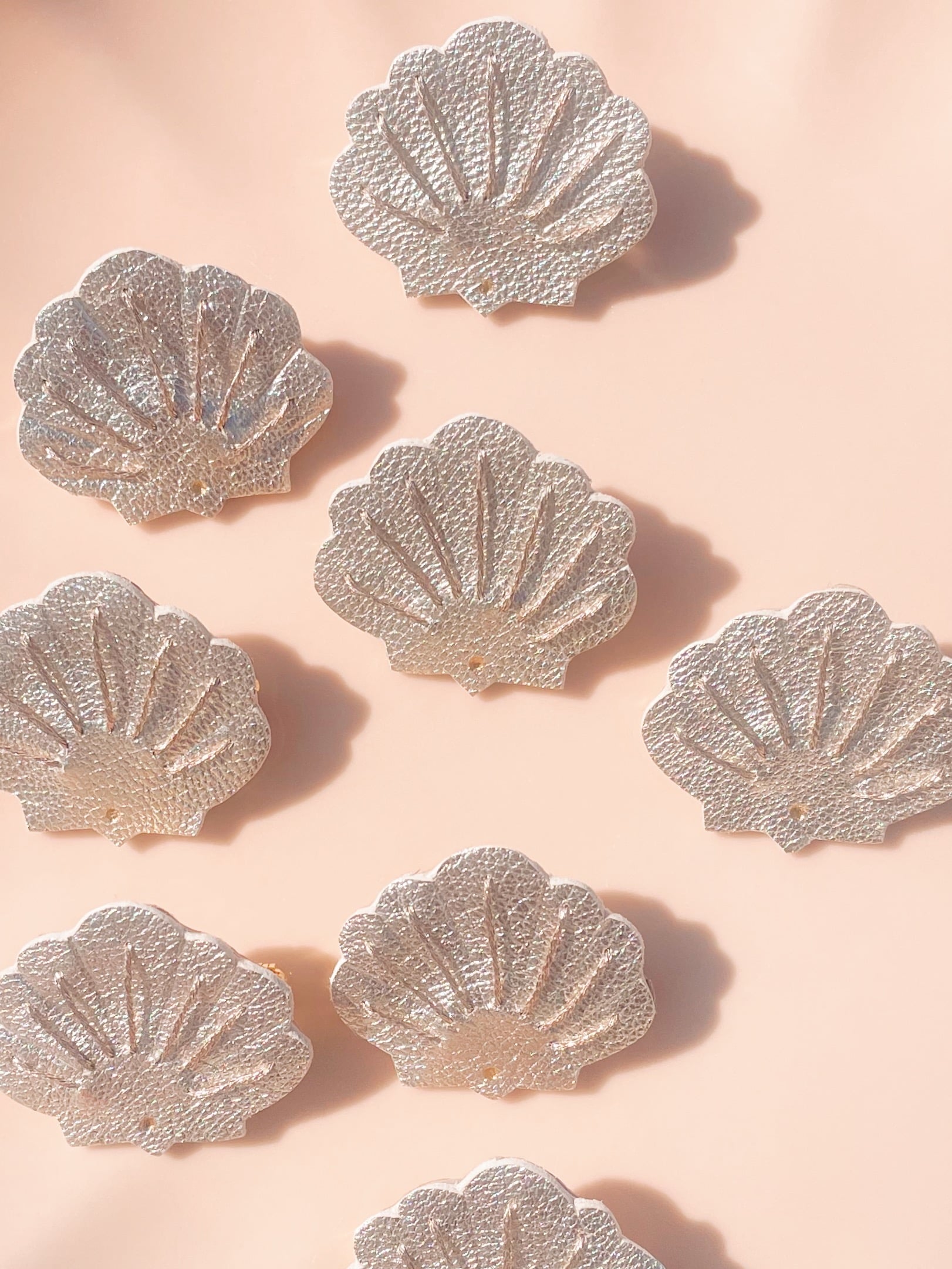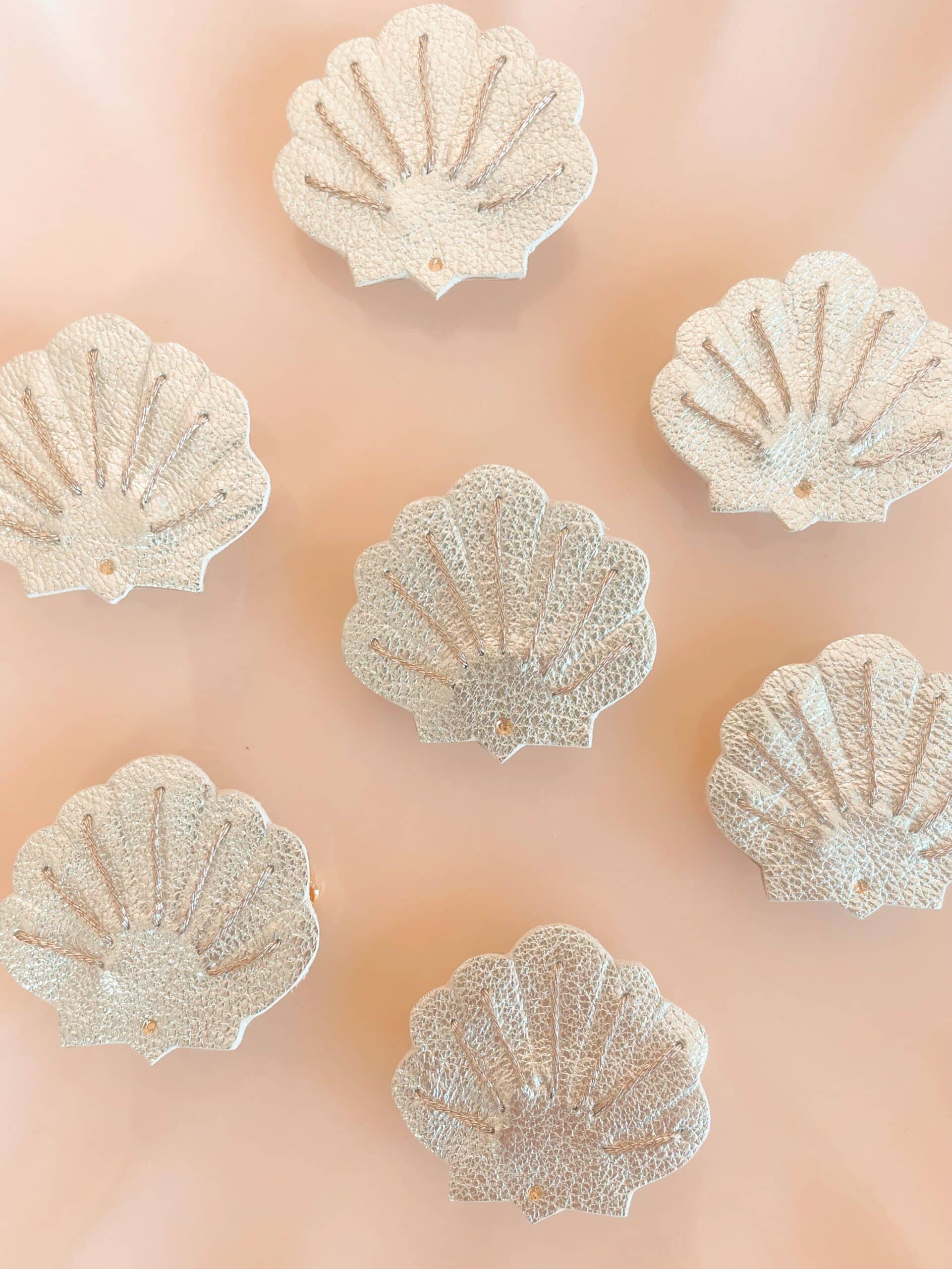Une broche coquillage à porter comme un grain de beauté pour une touche de poésie intemporelle. Cuir surcyclé, brodé main au fil métallisé or rose, dorure à chaud à l’or véritable et marquage à chaud, support de broche en laiton doré or fin. Dimensions : environ 3 cm. Chaque modèle est unique.