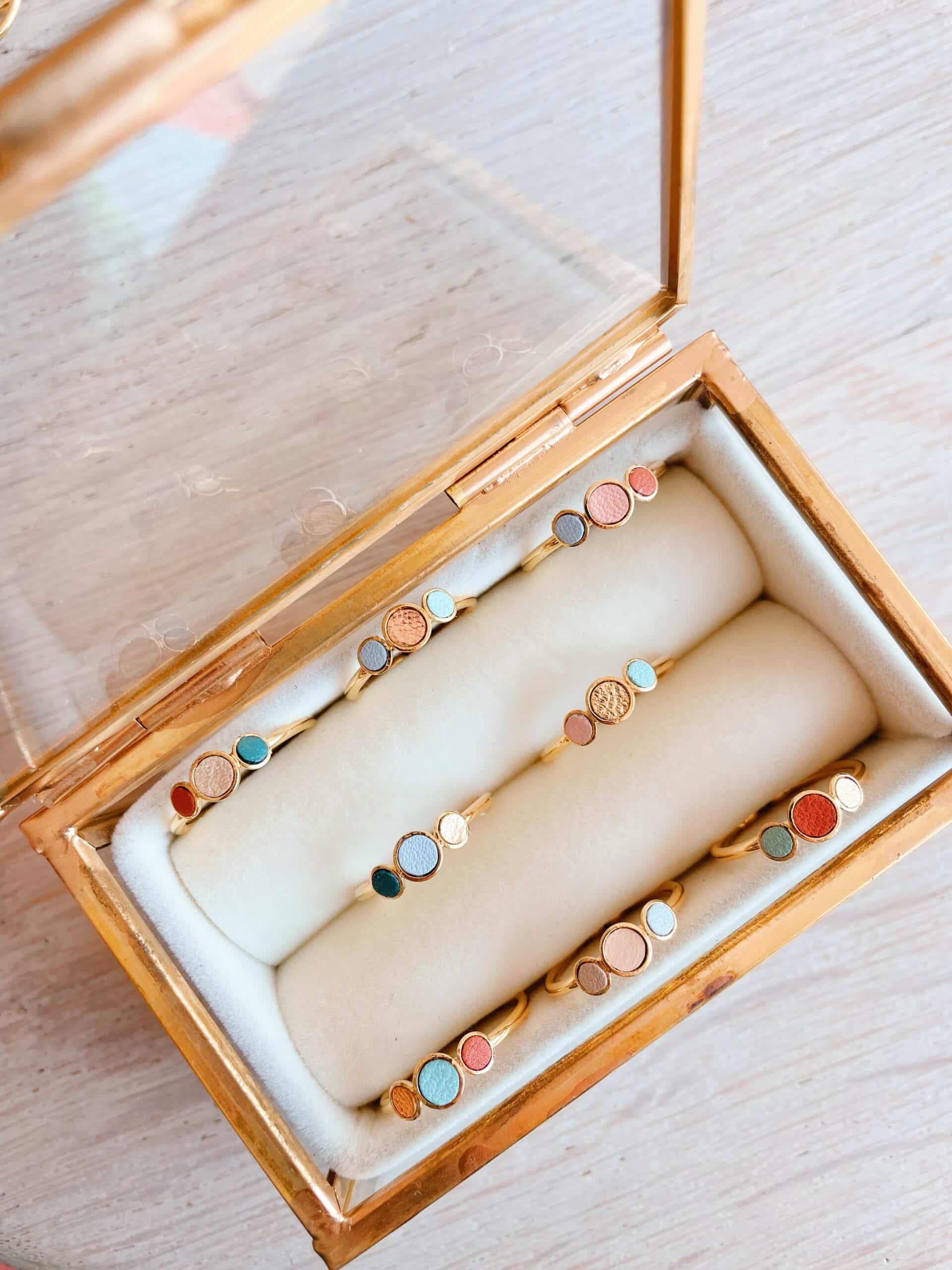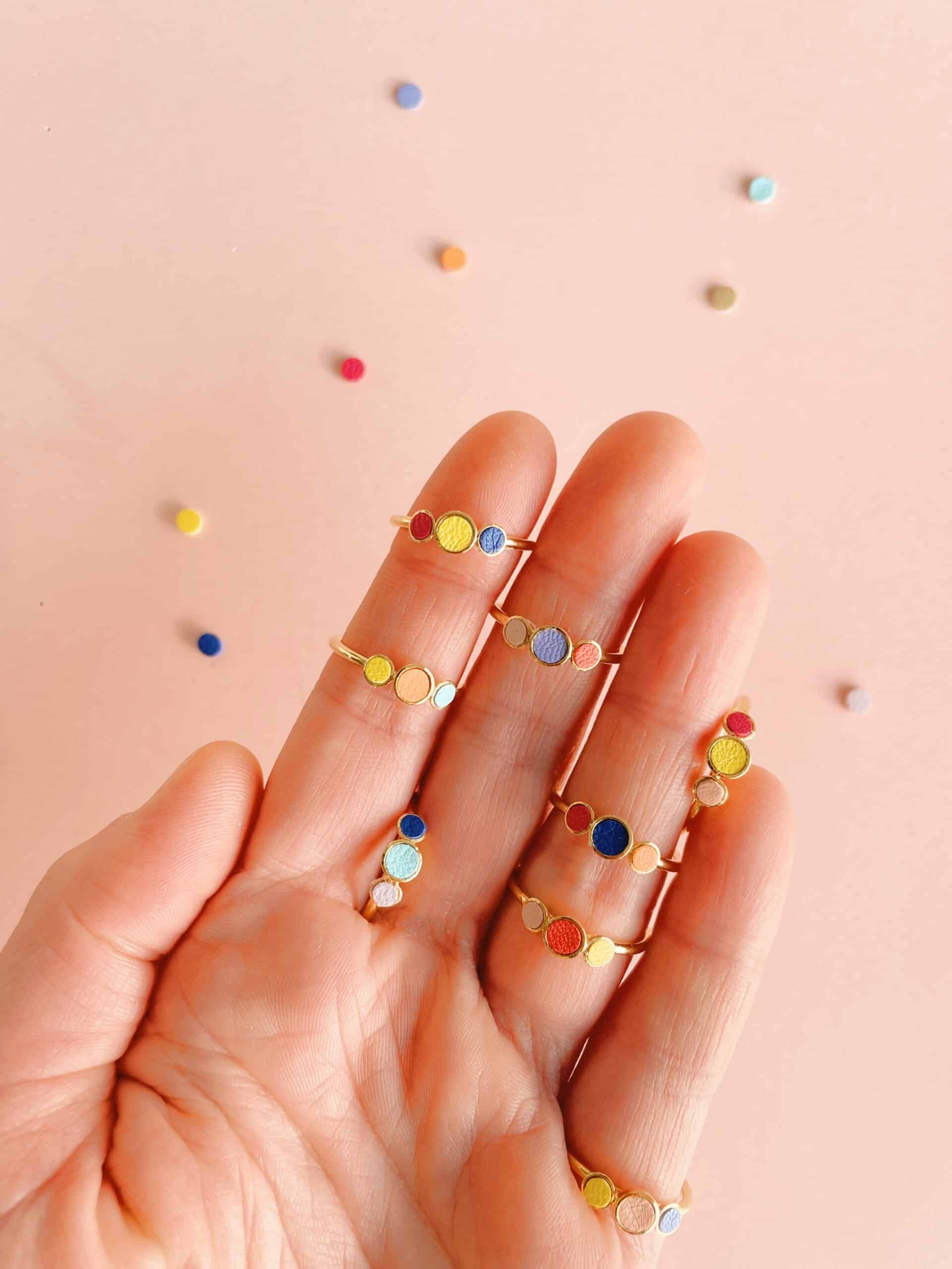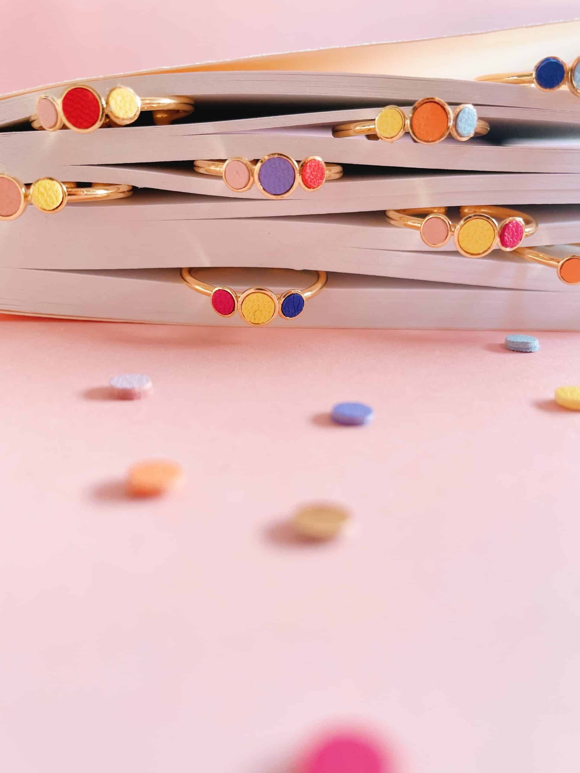 Confetto / Confetti — des pastilles de couleur pour accompagner la joie. Réalisées à partir des chutes de mes propres créations, les bagues confetti naissent en édition limitée, dix compositions uniques. Discrètes mais pleines de personnalité, elles traversent les styles et les occasions, se portent seules ou en accumulation. Un détail à prix doux, pour déposer sur la main quelques notes colorées — comme une promesse de gaieté. Découvrez aussi les bagues Fleurs de Bohème, le médaillon Le délicat, ou les pin’s ludiques façon gommettes — des accessoires discrets pour une touche colorée élégante et raffinée.
