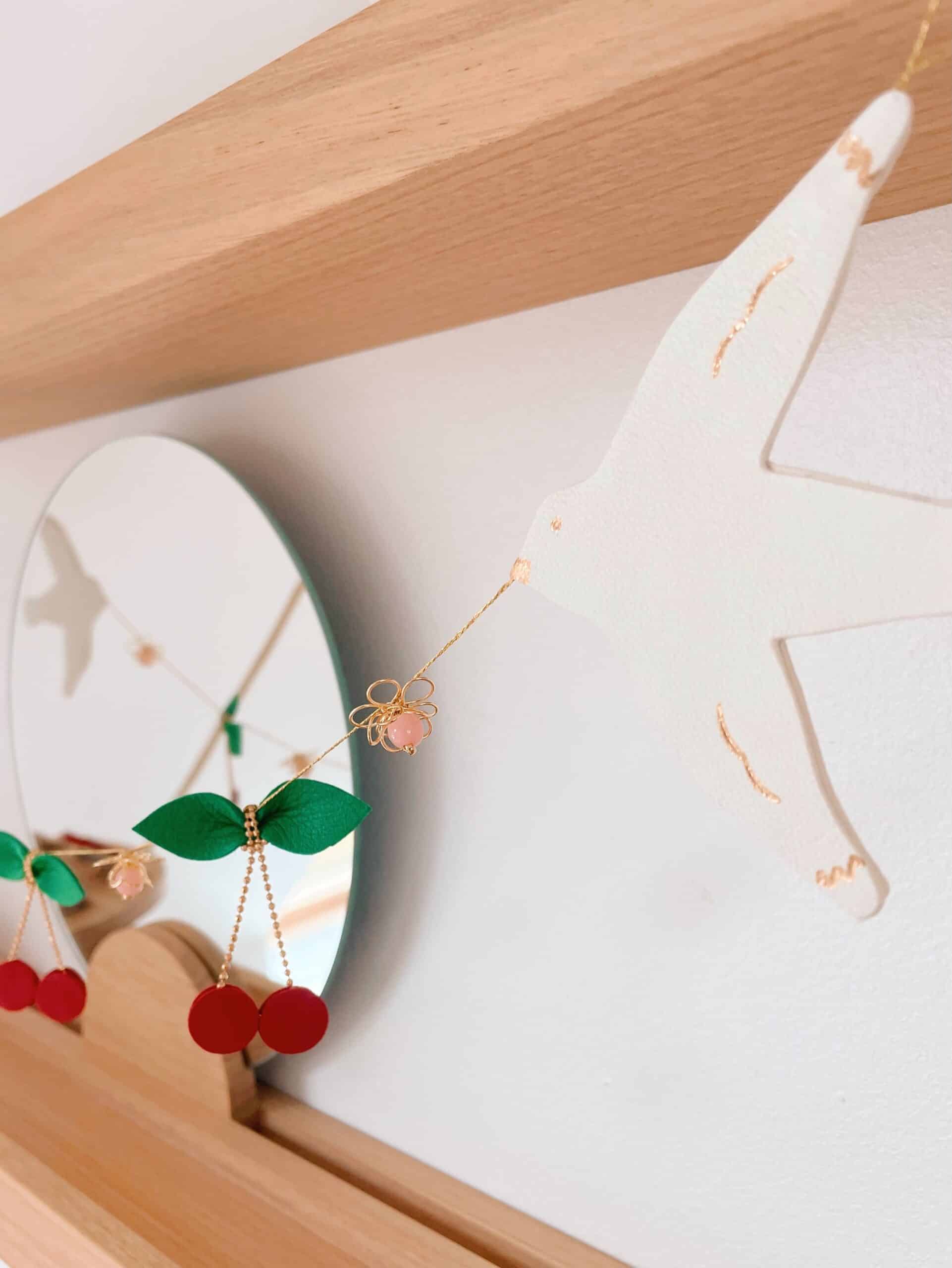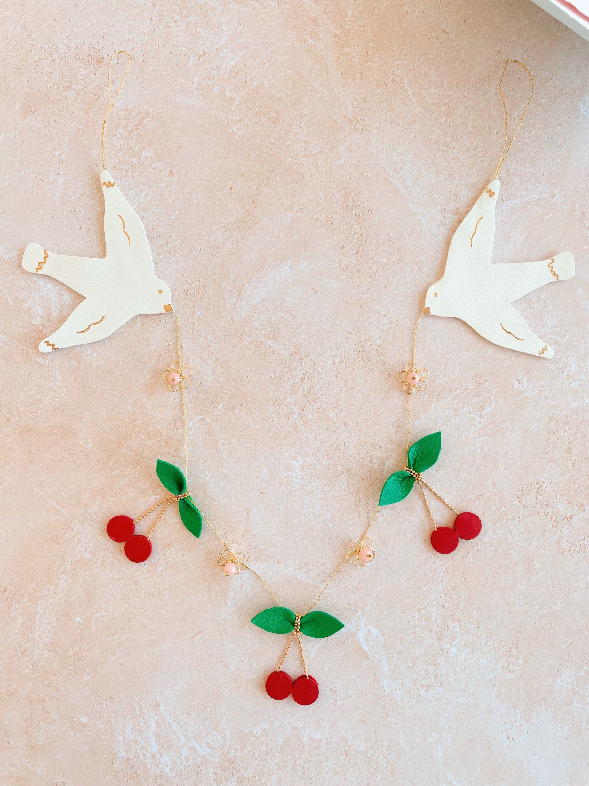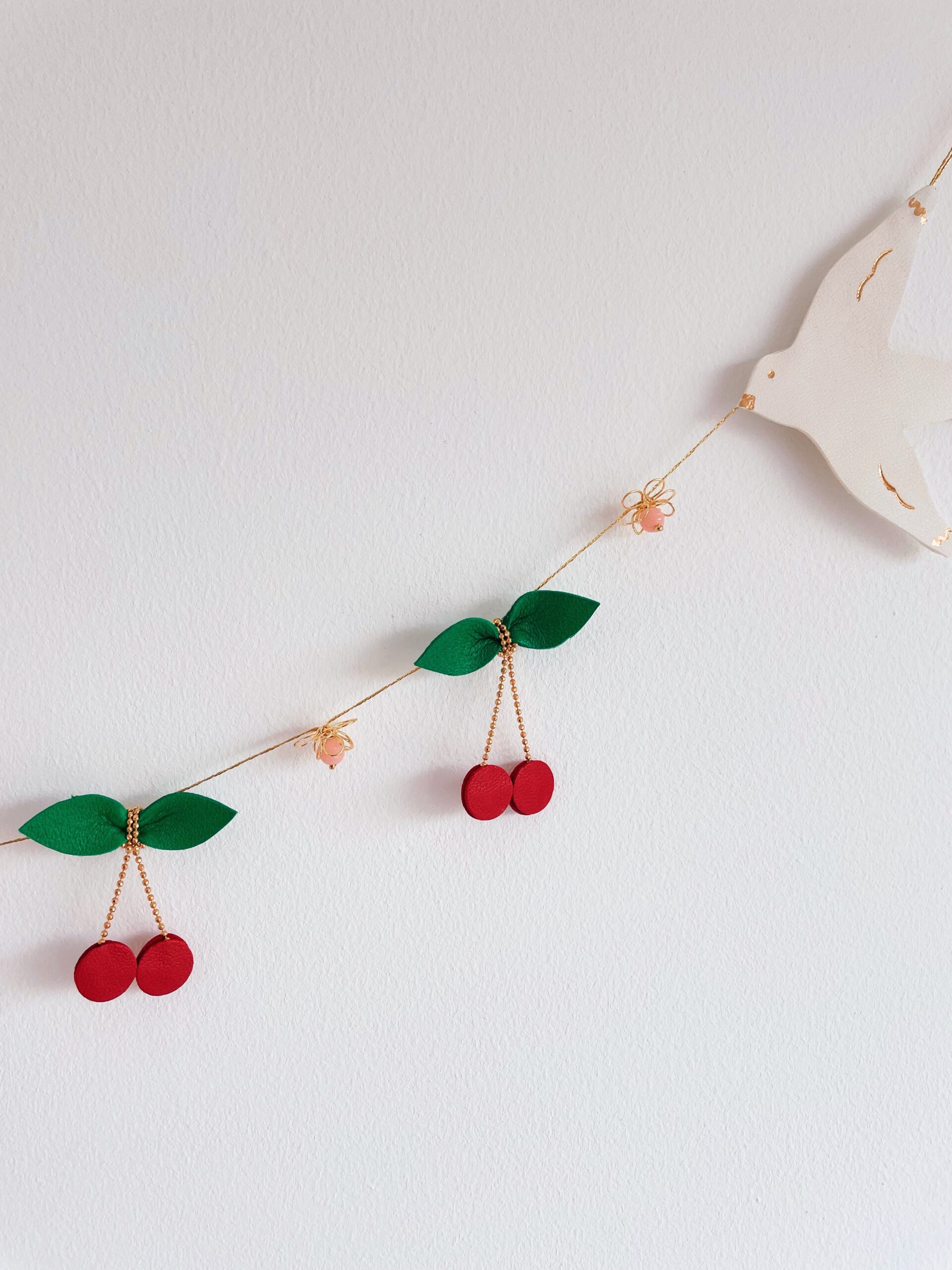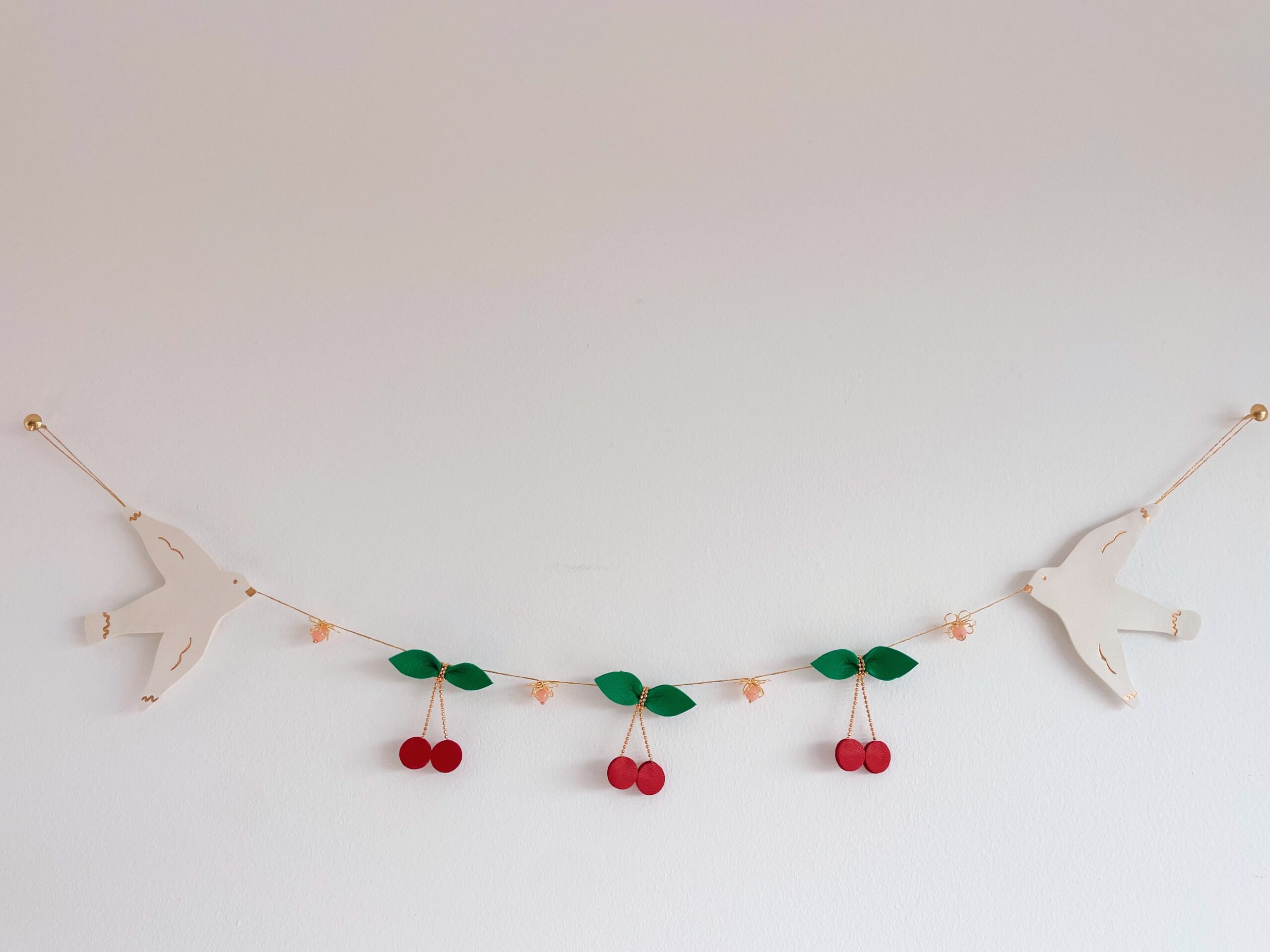 Découvrez ma collection de ribambelles, constituée de guirlandes décoratives durables en cuir surcyclé. Il s’agit d’un travail artisanal d’ennoblissement d’excédents provenant directement d’une tannerie française (upcycling). Cette guirlande de cerises et de fleurs, est encadrée d’oiseaux messagers, silencieux poètes, des mouettes qui évoquent symboliquement les colombes. Chaque détail est rehaussé d’or véritable, ajoutant une touche de luxe à cette composition délicate. Ce bijou mural, entièrement façonné et assemblé à la main, mêle fleurs de laiton doré, perles vintage de couleur rosée, chaîne boule et fil métallisé doré, pour un résultat d’une finesse inégalée. Une pièce unique qui apportera une touche de poésie et de raffinement à votre intérieur. Elle peut être déclinée sur commande dans d’autres coloris et modèles. Cette décoration murale intemporelle est prévue pour se fixer contre un mur et ainsi sublimer n’importe quelle pièce de la maison. Elle fait aussi un cadeau idéal pour des fiançailles, un mariage, une naissance et autres jolies occasions qui rendent la vie plus jolie ou tout simplement pour se faire plaisir. A accrocher à l’aide des clous fournis ou de tout autre élément de fixation adapté à votre support. Cette ribambelle s’accorde parfaitement avec nos éternelles fleurs à la tige ou avec une paire de boucles d’oreilles. Pour en savoir plus concernant le processus de fabrication, mon engagement et les valeurs de la marque, cliquez ici