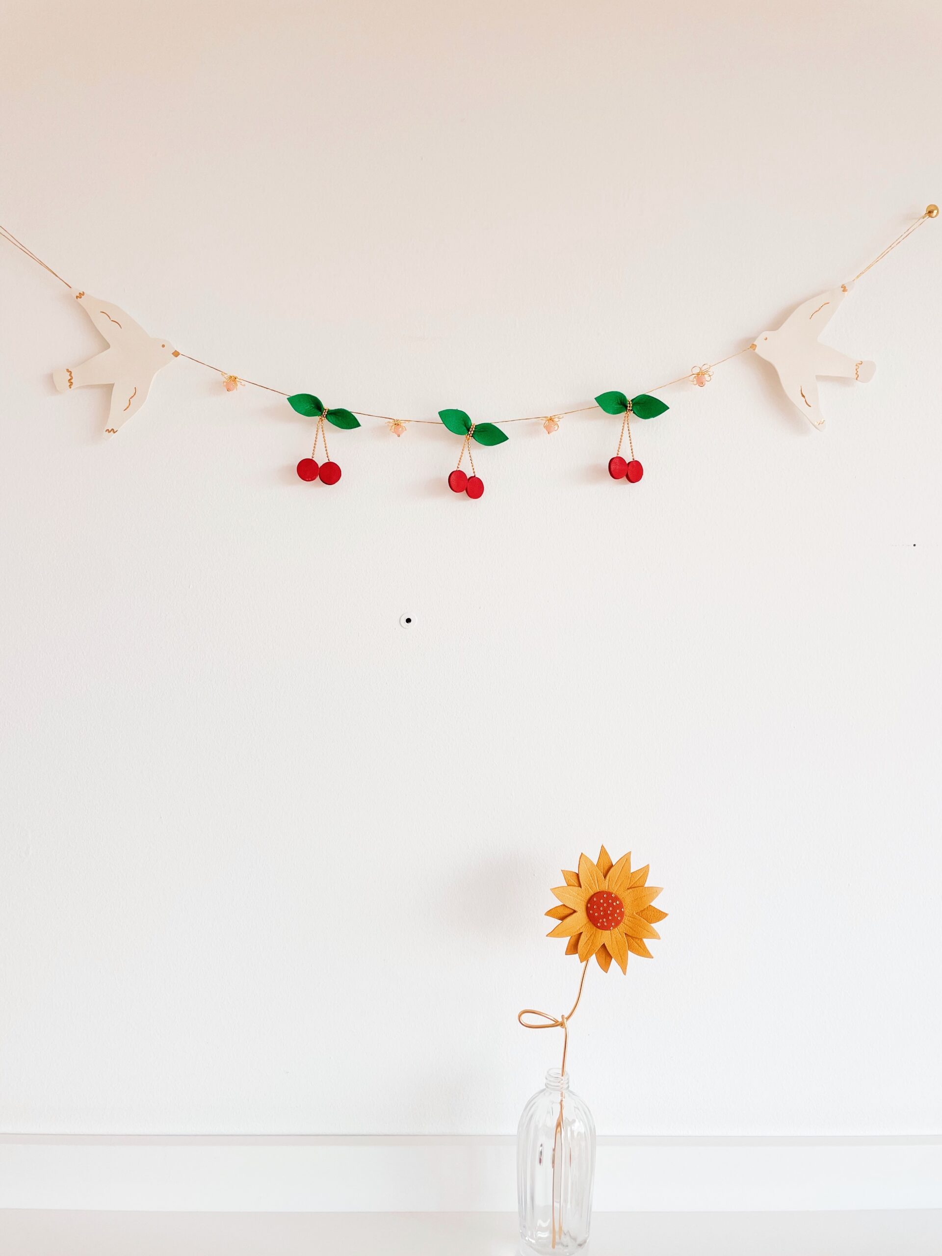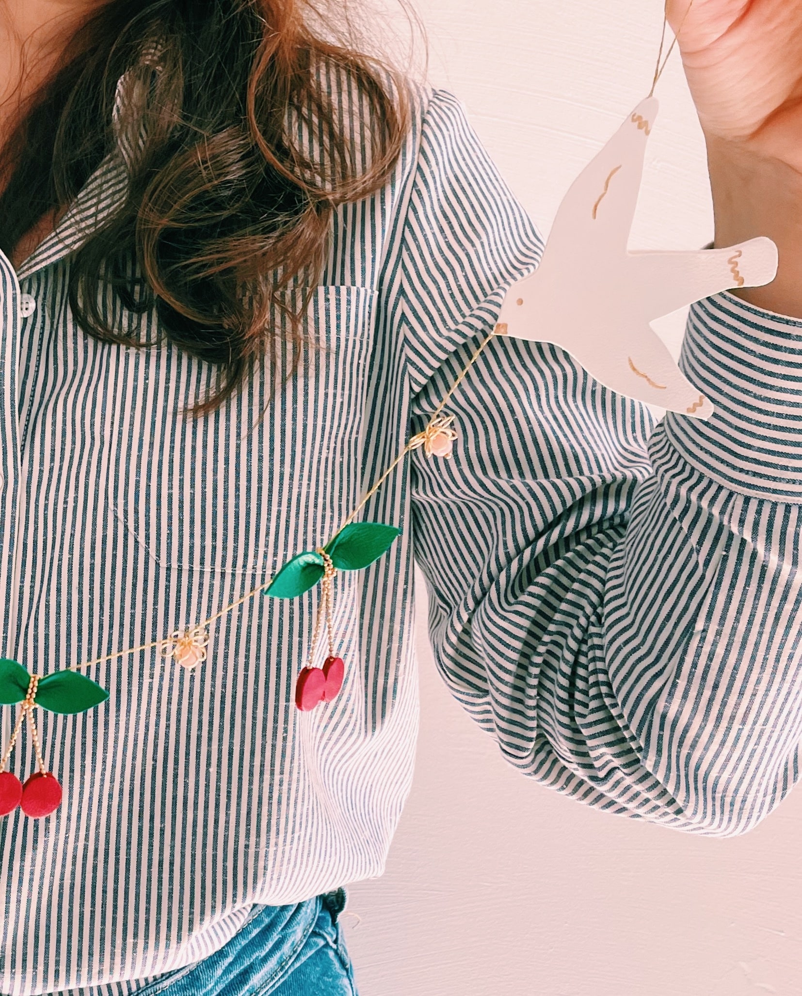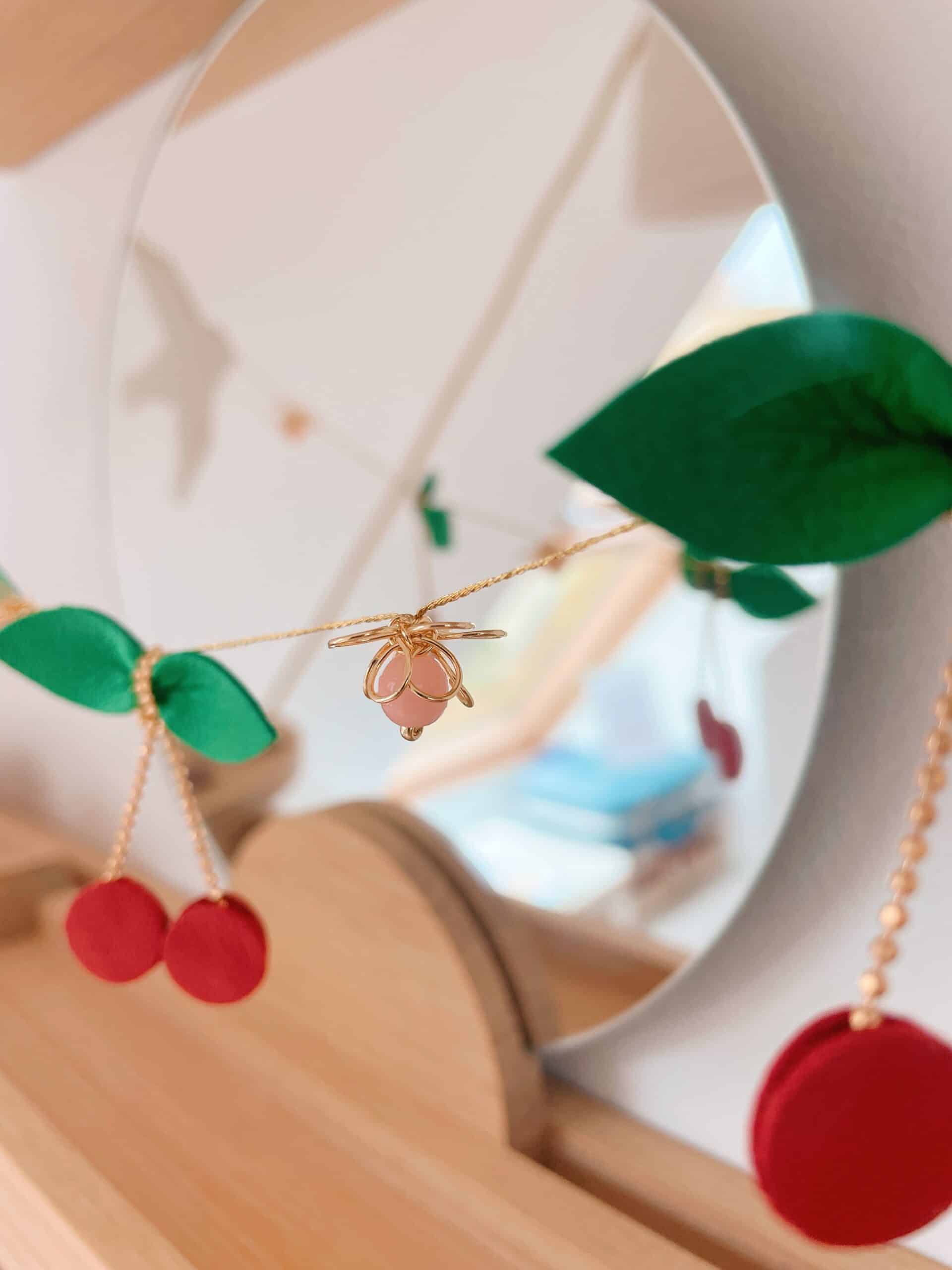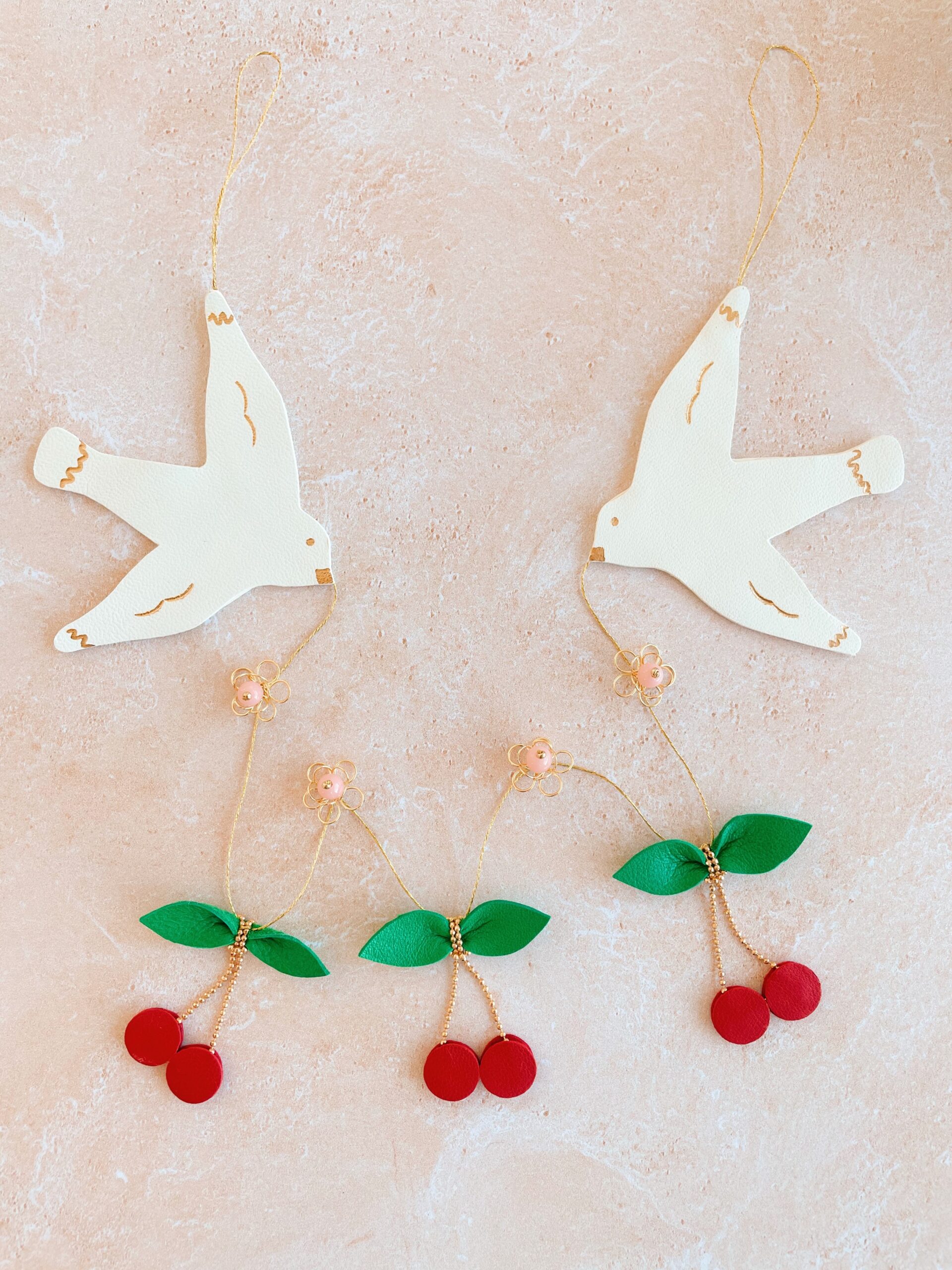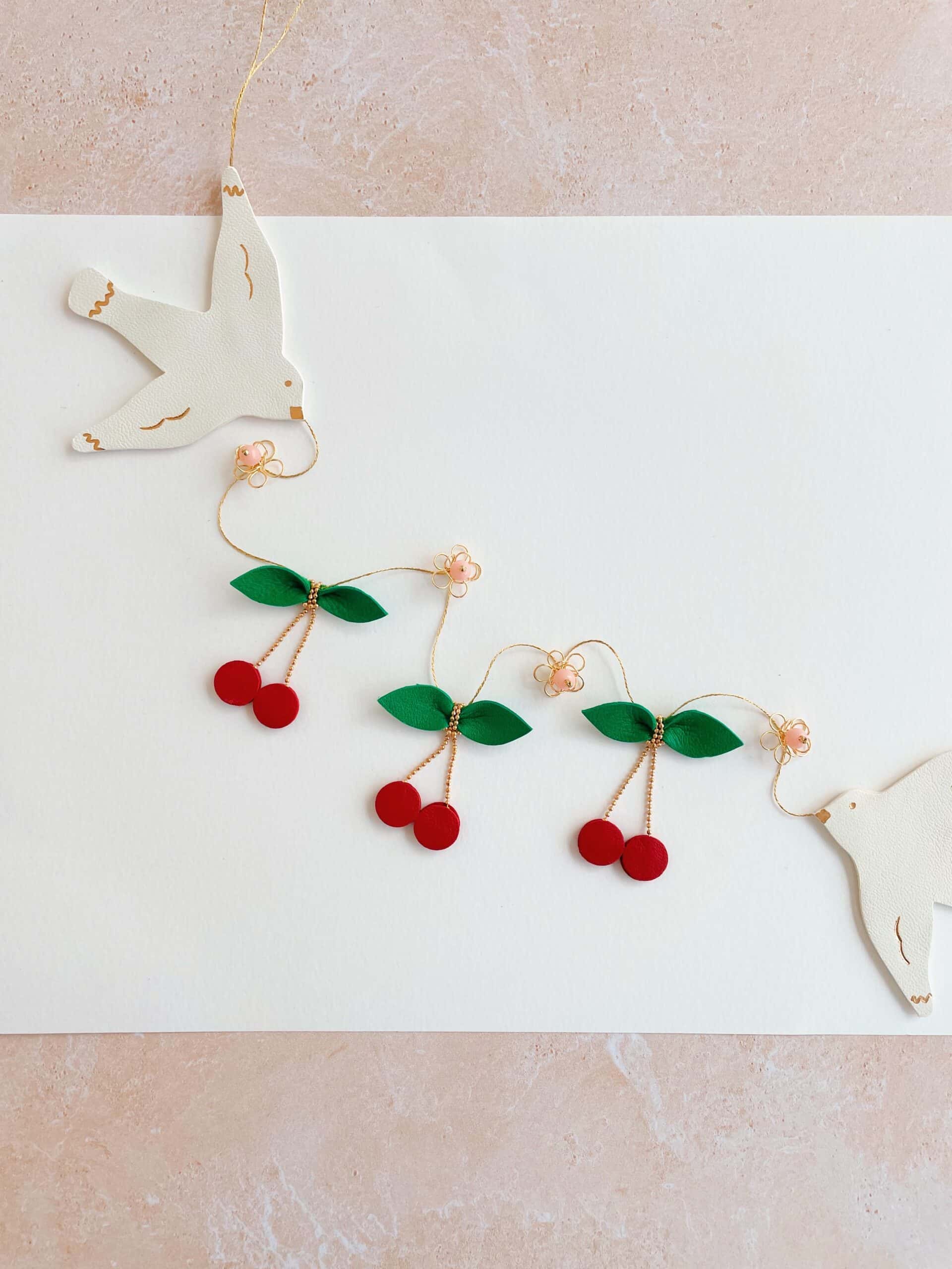 Découvrez ma collection de ribambelles, constituée de guirlandes décoratives durables en cuir surcyclé. Il s’agit d’un travail artisanal d’ennoblissement d’excédents provenant directement d’une tannerie française (upcycling). Cette guirlande de cerises et de fleurs, est encadrée d’oiseaux messagers, silencieux poètes, des mouettes qui évoquent symboliquement les colombes. Chaque détail est rehaussé d’or véritable, ajoutant une touche de luxe à cette composition délicate. Ce bijou mural, entièrement façonné et assemblé à la main, mêle fleurs de laiton doré, perles vintage de couleur rosée, chaîne boule et fil métallisé doré, pour un résultat d’une finesse inégalée. Une pièce unique qui apportera une touche de poésie et de raffinement à votre intérieur. Elle peut être déclinée sur commande dans d’autres coloris et modèles. Cette décoration murale intemporelle est prévue pour se fixer contre un mur et ainsi sublimer n’importe quelle pièce de la maison. Elle fait aussi un cadeau idéal pour des fiançailles, un mariage, une naissance et autres jolies occasions qui rendent la vie plus jolie ou tout simplement pour se faire plaisir. A accrocher à l’aide des clous fournis ou de tout autre élément de fixation adapté à votre support. Cette ribambelle s’accorde parfaitement avec nos éternelles fleurs à la tige ou avec une paire de boucles d’oreilles. Pour en savoir plus concernant le processus de fabrication, mon engagement et les valeurs de la marque, cliquez ici